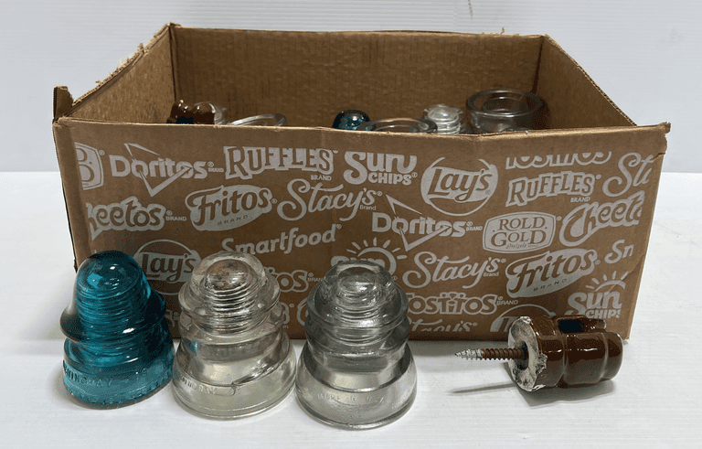 Insulators, include: (15) Whitall Tatum No. 1, 3- chipped, Hemingray, No. 42; (3) Hemingray No. 45, 1- chipped; Hemingray No. 19 green; HG Company petticoat green; (4) Brown with screw tip