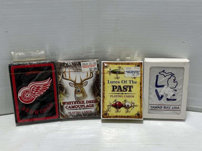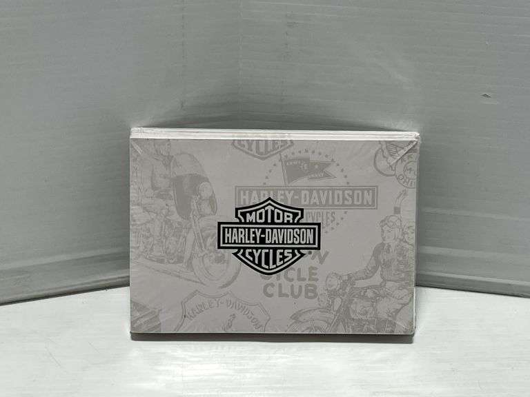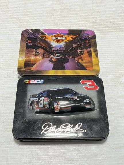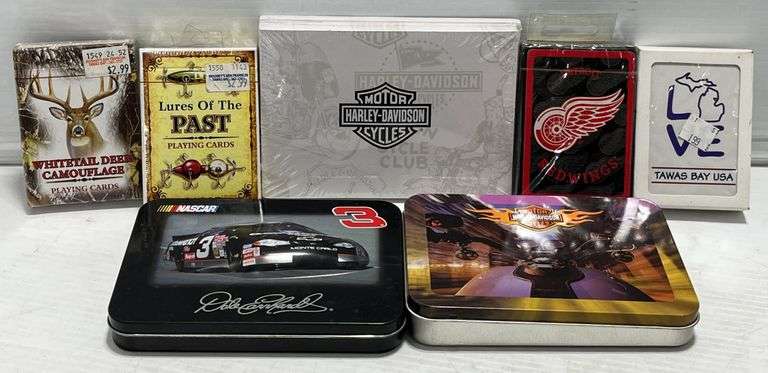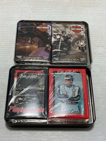 Collectible playing cards, all never opened, includes: (1) Harley-Davidson tin, 2- cards inside; (1) Pack of Harley-Davidson "Thank You" cards and envelope; (4) Other playing card decks; (1) Dale Earnhardt tin, Two- 5 3/4" x 4 1/4"; Five- 3 3/4" x 2 1/2", new