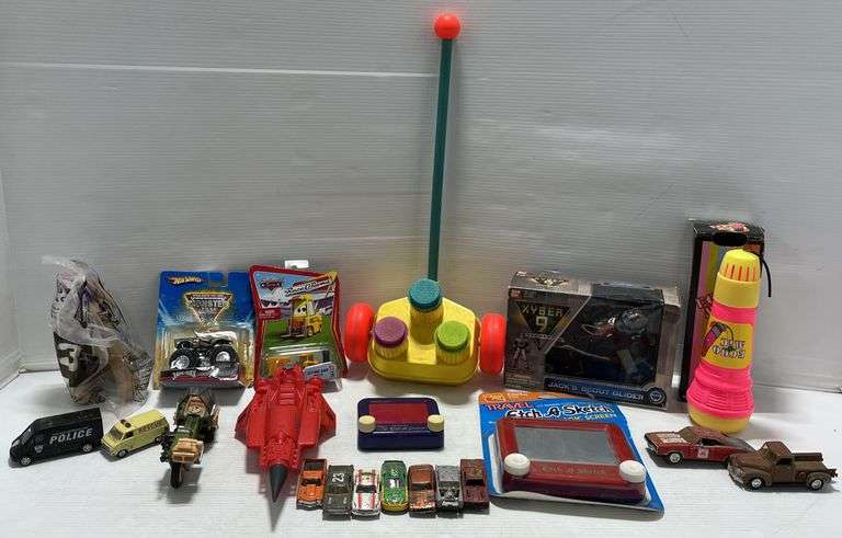 Assorted older and newer toys, includes: Travel Etch-a-Sketch with original package, sealed; Cars, Echo Magic Microphone with box, Fisher Price Happy Whistlers Push Pop up, and more, up to 22"L, NOS