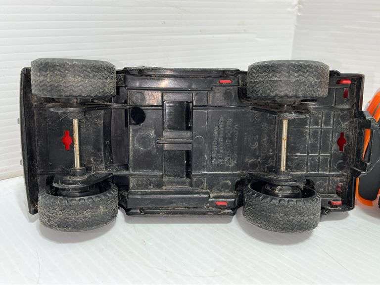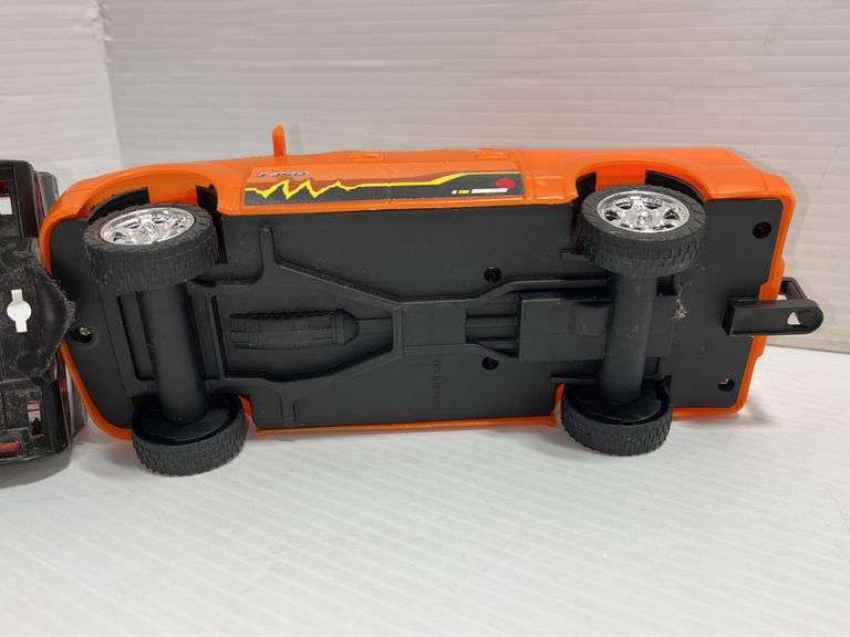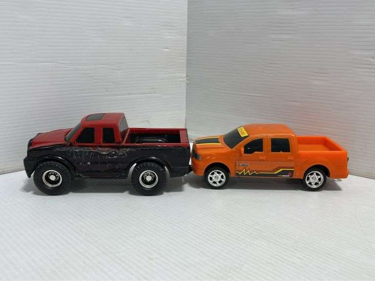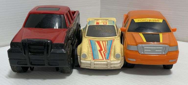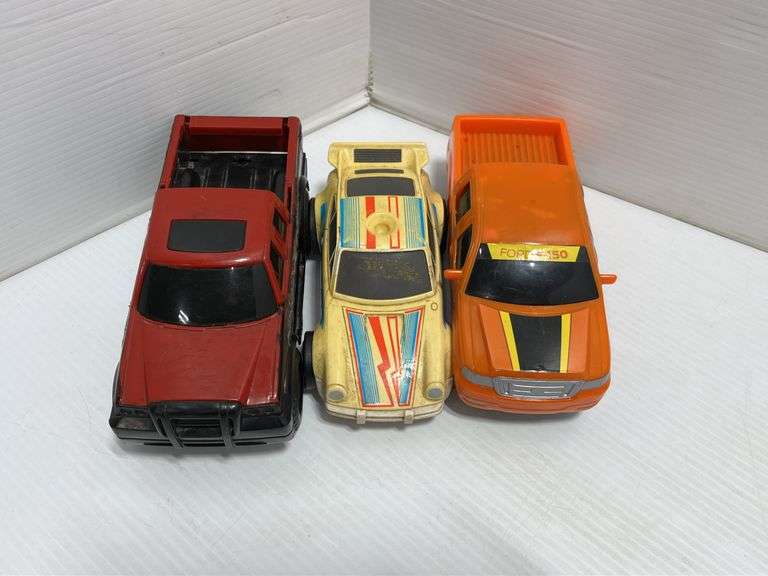 Older plastic vehicles; Ford F-150, made in China, 8"L; Hasbro Tonka Racing Truck, No. 50254, 2011, 8"L; Porsche 911 Turbo 1985, 7"L, used