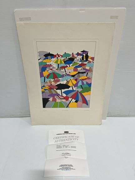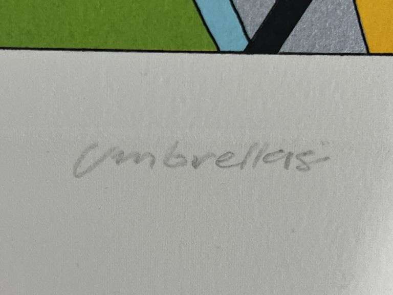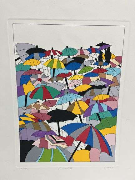 The Serigraph signed and numbered, 22/150, umbrellas signed Cobalt, never displayed, 18 1/2" x 24", see back of backer board, NIP