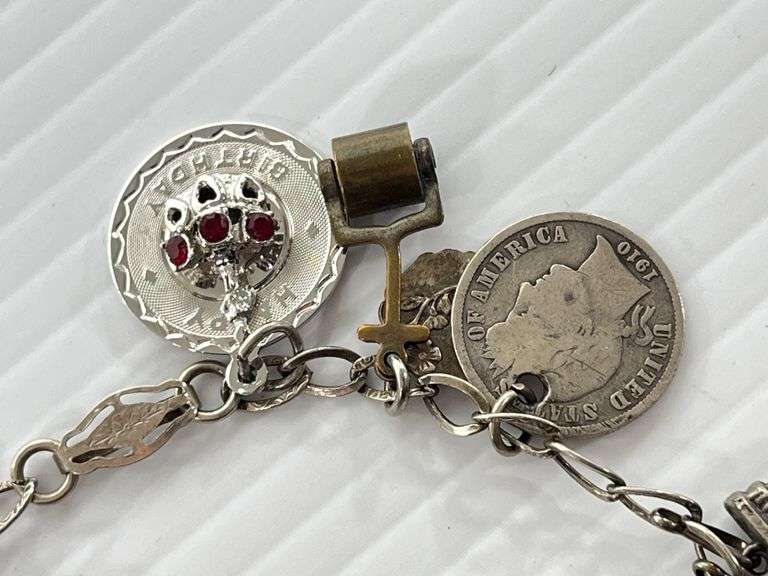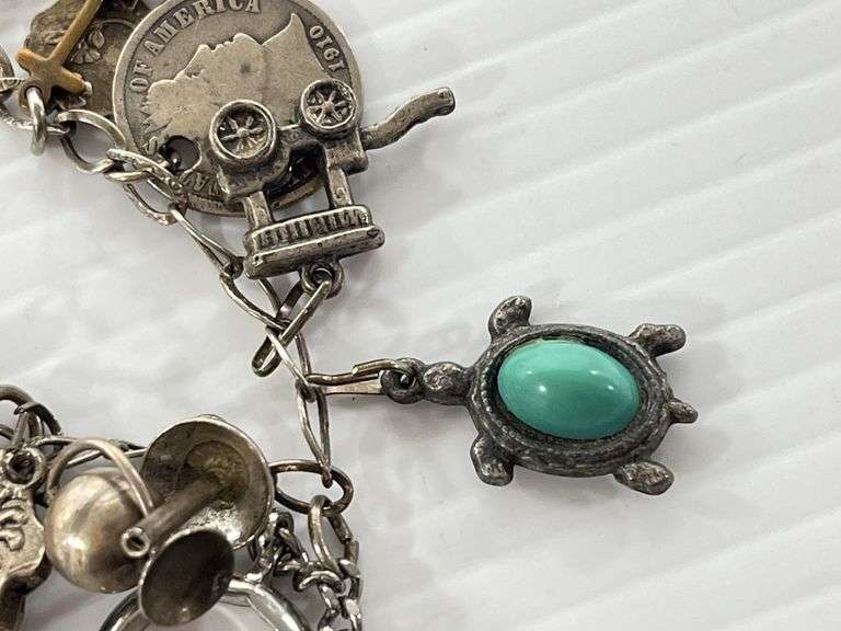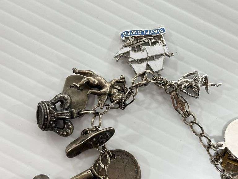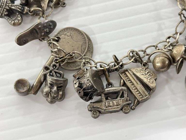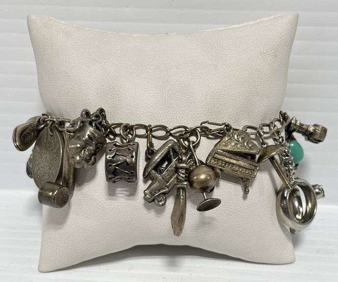 Old charm bracelet, 7 1/2"L; (20) Charms, some marked Italy and Sterling, some magnetic, Except where specifically noted, jewelry lots have not been authenticated. Stone authenticity is not guaranteed by Albrecht Auction and should be personally determined by bidder prior to bidding. Jewelry with precious metal content will be listed as being marked or stamped. Jewelry that is not marked or stamped should not be assumed to contain precious metal content.