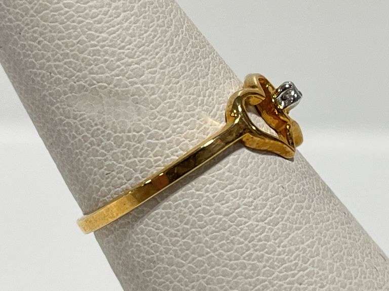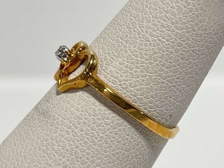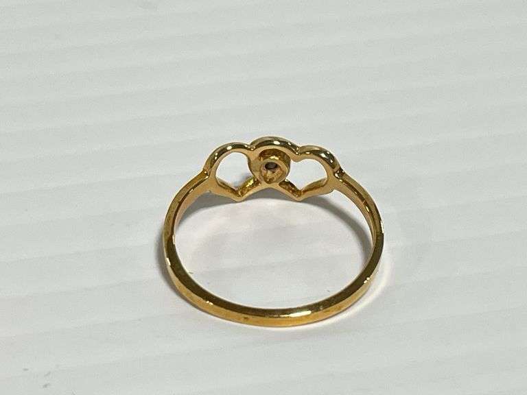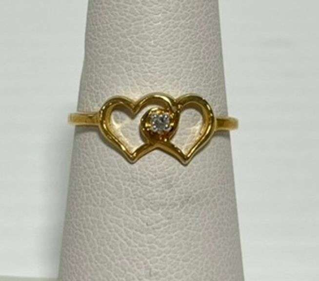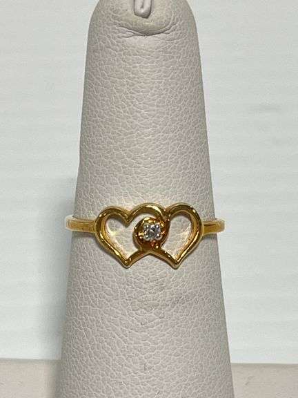 10K Yellow gold double heart diamond accented jewelry ring, size 5 1/4, NOS, never worn, Except where specifically noted, jewelry lots have not been authenticated. Stone authenticity is not guaranteed by Albrecht Auction and should be personally determined by bidder prior to bidding. Jewelry with precious metal content will be listed as being marked or stamped. Jewelry that is not marked or stamped should not be assumed to contain precious metal content.