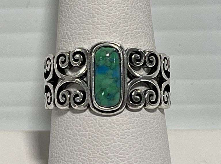 Genuine turquoise filigree band ring, marked 925 sterling silver, oxidized finish, face height of 11.7mm, size 8, new, Except where specifically noted, jewelry lots have not been authenticated. Stone authenticity is not guaranteed by Albrecht Auction and should be personally determined by bidder prior to bidding. Jewelry with precious metal content will be listed as being marked or stamped. Jewelry that is not marked or stamped should not be assumed to contain precious metal content.