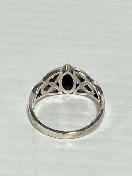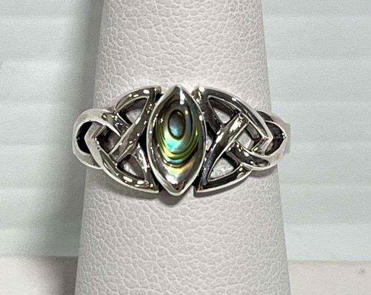 Celtic knot abalone stone ring, size 7, marked 925 sterling silver, face height of 9mm, new, Except where specifically noted, jewelry lots have not been authenticated. Stone authenticity is not guaranteed by Albrecht Auction and should be personally determined by bidder prior to bidding. Jewelry with precious metal content will be listed as being marked or stamped. Jewelry that is not marked or stamped should not be assumed to contain precious metal content.