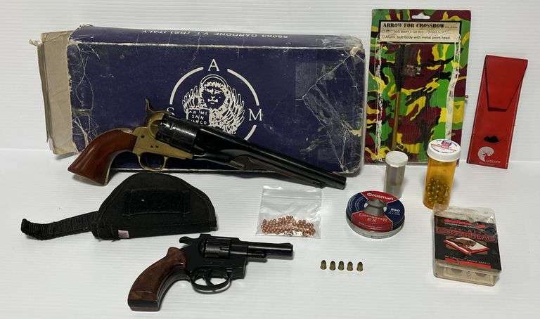 Older revolvers and more, 1860 Colt Army .44 caliber percussion frame brass revolver RV610BF is missing barrel wedge assembly, 12-gauge, include: Remington full choke tube, Crosman Destroyer Ex 45mm .177 caliber pellets, Crosman Copperhead Premium grade BBs, (3) Unicorn darts in original case, metal arrow for crossbow, Battle of steel singlot ammo balls, serial no. 28771, rev 7/94, made in Italy, 25063 Gardone VT, Marksman blank cap pistol with caps, made in Italy, as is