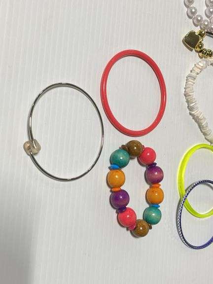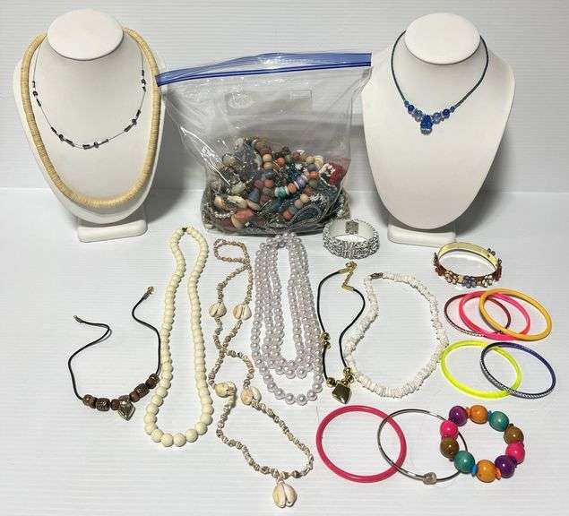 (35) Necklaces, (11) Bracelets, (2) Watches, and (5) Pins, up to 30"L; Except where specifically noted, jewelry lots have not been authenticated. Stone authenticity is not guaranteed by Albrecht Auction and should be personally determined by bidder prior to bidding. Jewelry with precious metal content will be listed as being marked or stamped. Jewelry that is not marked or stamped should not be assumed to contain precious metal content.