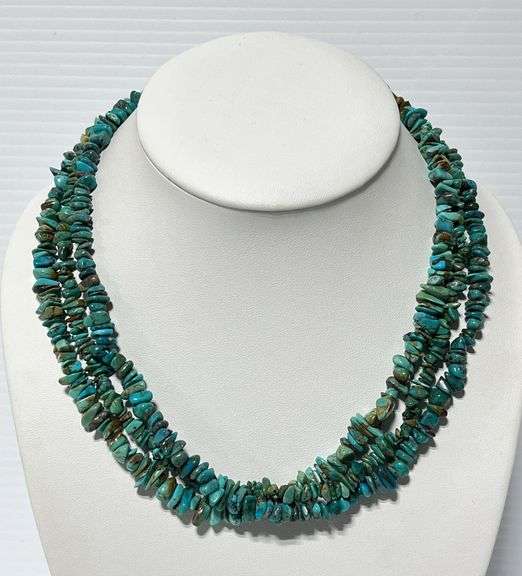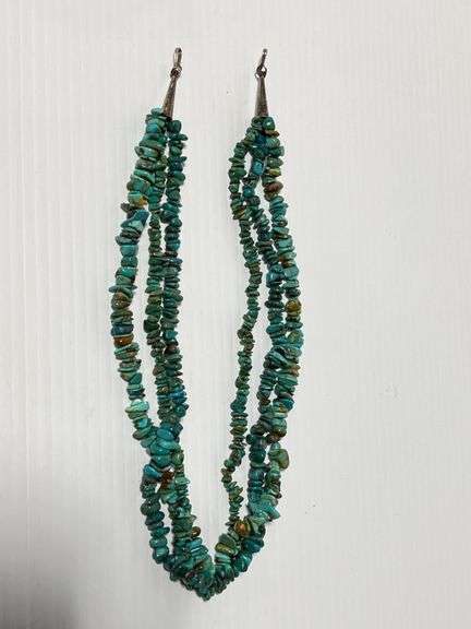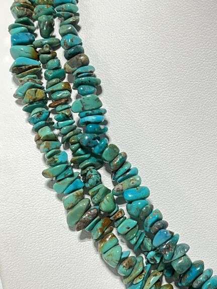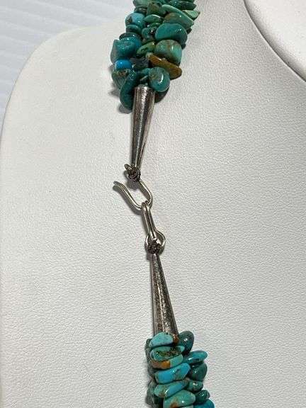 Older sterling silver multi-strand turquoise necklace from AZ, 18 1/2"L; Except where specifically noted, jewelry lots have not been authenticated. Stone authenticity is not guaranteed by Albrecht Auction and should be personally determined by bidder prior to bidding. Jewelry with precious metal content will be listed as being marked or stamped. Jewelry that is not marked or stamped should not be assumed to contain precious metal content.