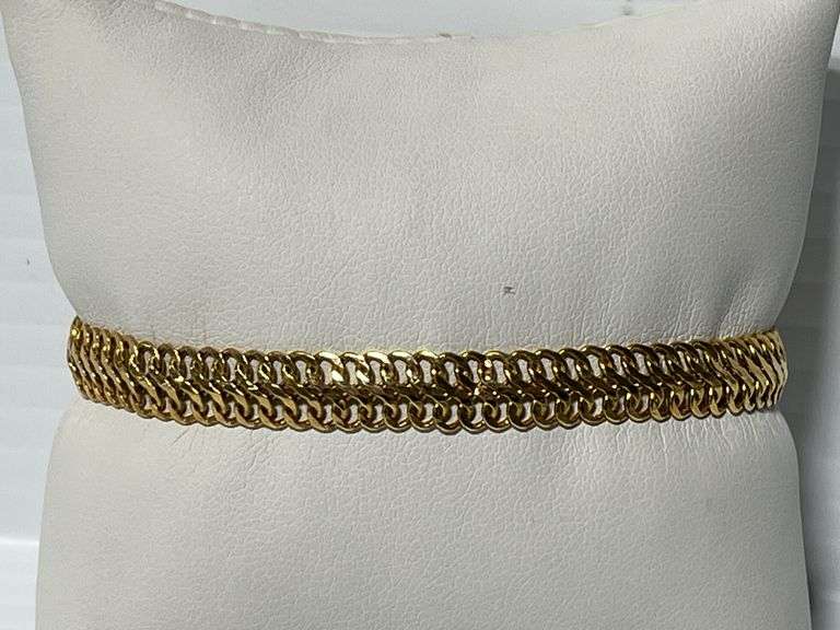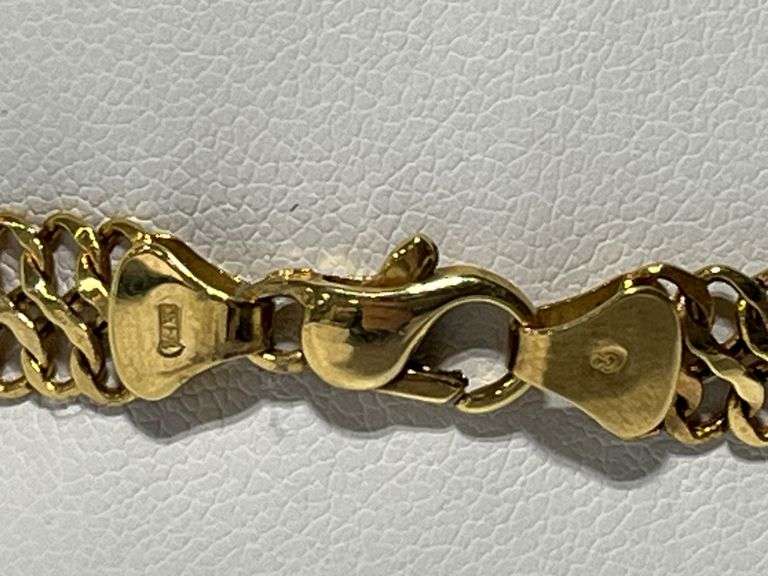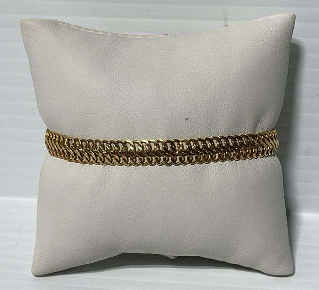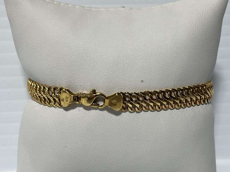 Gold bracelet, marked Italy, 7"L, flat "S" chain; Except where specifically noted, jewelry lots have not been authenticated. Stone authenticity is not guaranteed by Albrecht Auction and should be personally determined by bidder prior to bidding. Jewelry with precious metal content will be listed as being marked or stamped. Jewelry that is not marked or stamped should not be assumed to contain precious metal content.