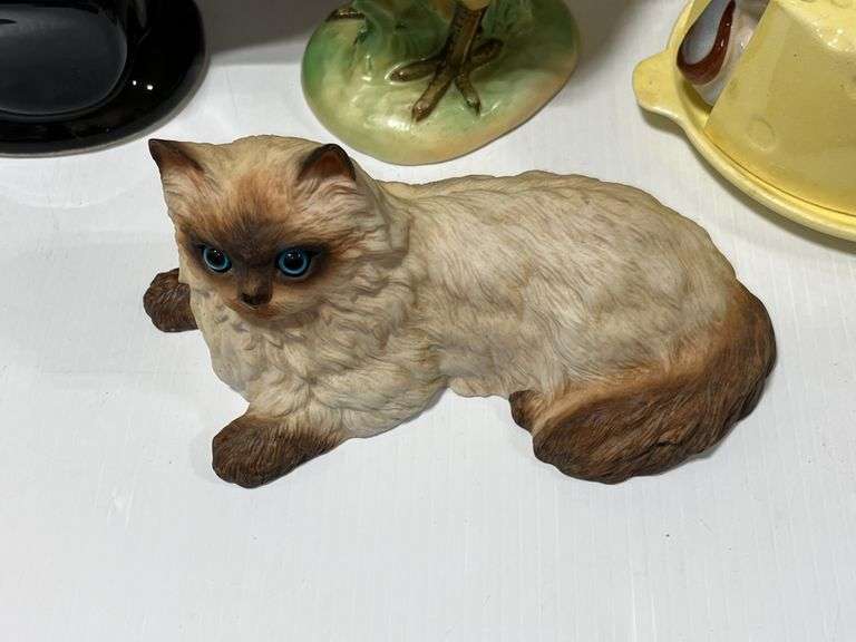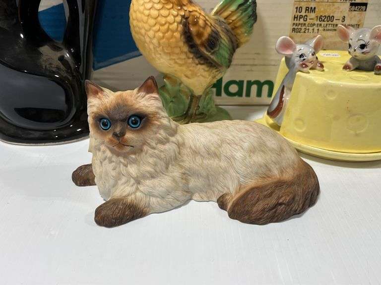 Ceramic cat figurines, rooster, and cheese mice, 12 1/2"H, good