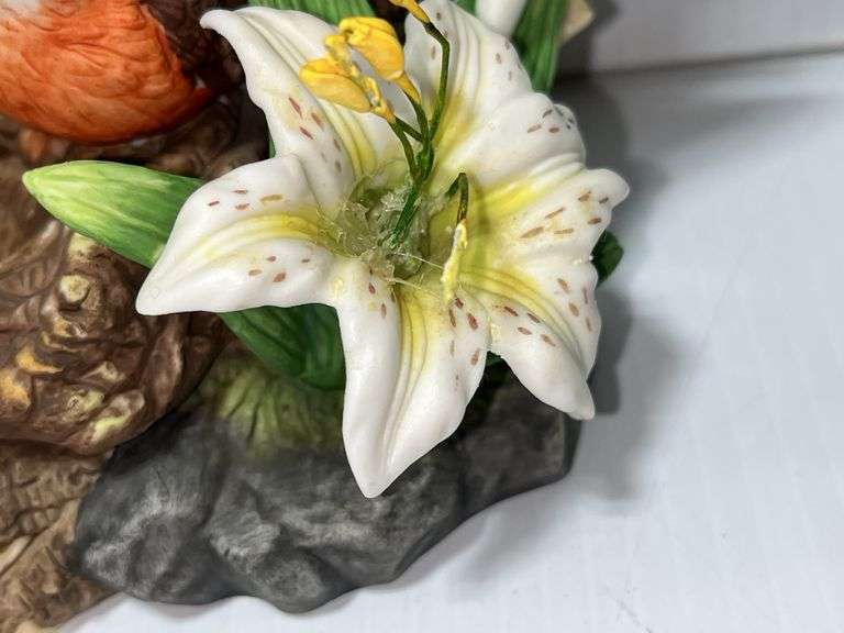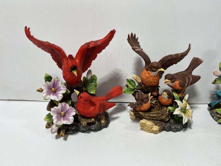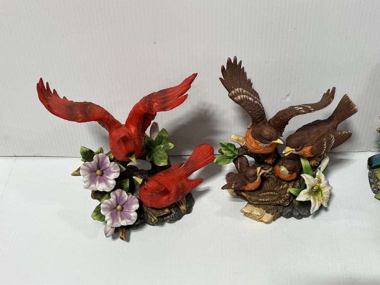 (5) Ceramic bird figurines, Cardinal, Blue Jay, and Robin, the Blue Jay one has flower glued back on, good condition, up to 7"H