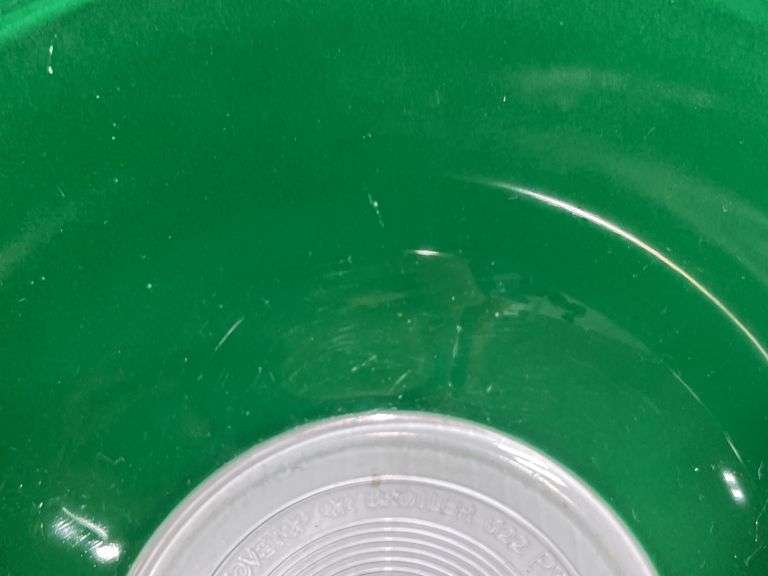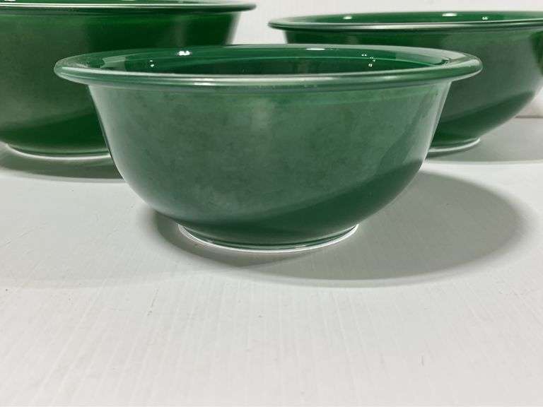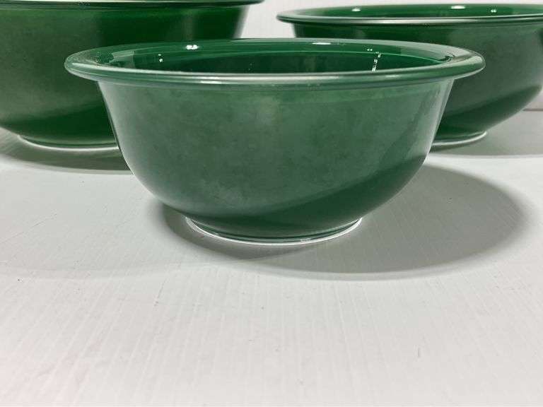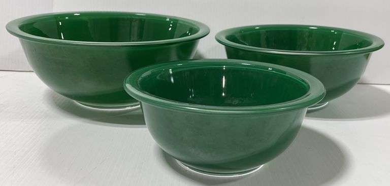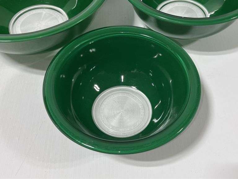 (3) Green glass Pyrex mixing bowls, 2 1/2, 1 1/2, and 1- Liter sizes, few small paint chips, but overall good condition, up to 9 3/4"Dia x 4"H