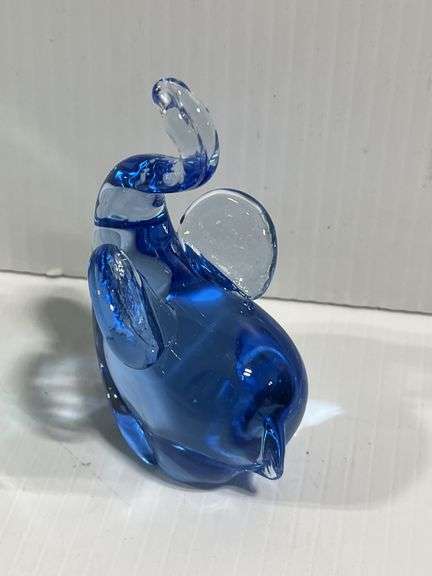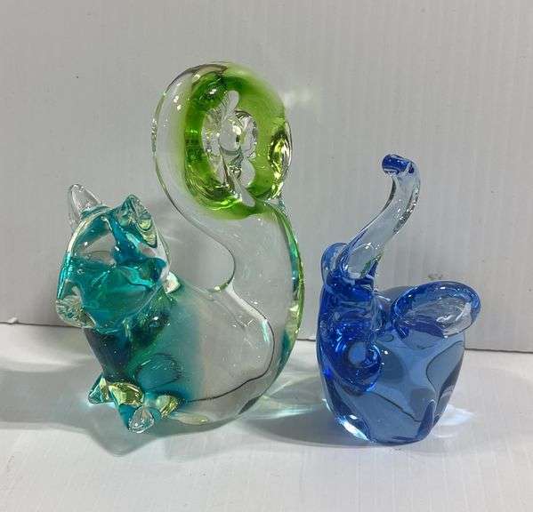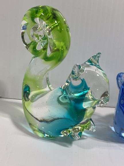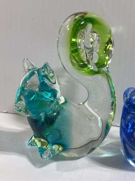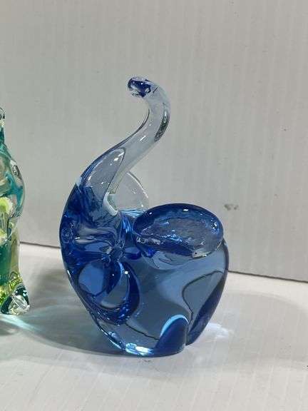 (2) Art glass figurines, 1- elephant, green and clear, 4"W x 5 1/2"H, 1- Squirrel, blue/green/clear, 3 1/2"L x 4 1/4"H