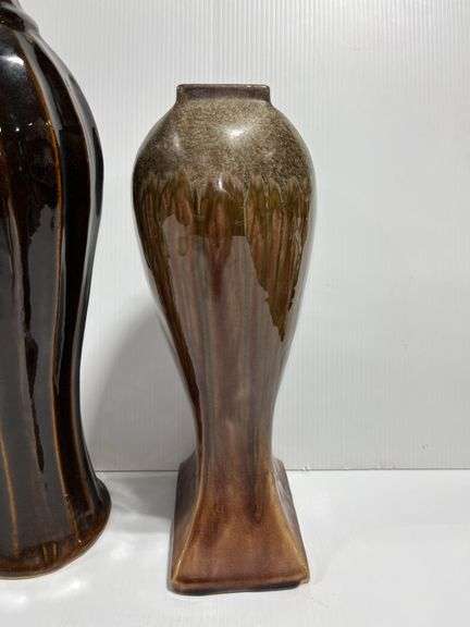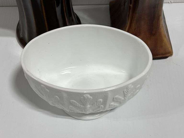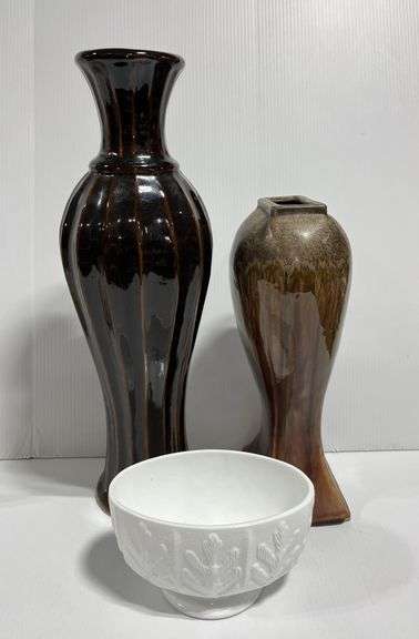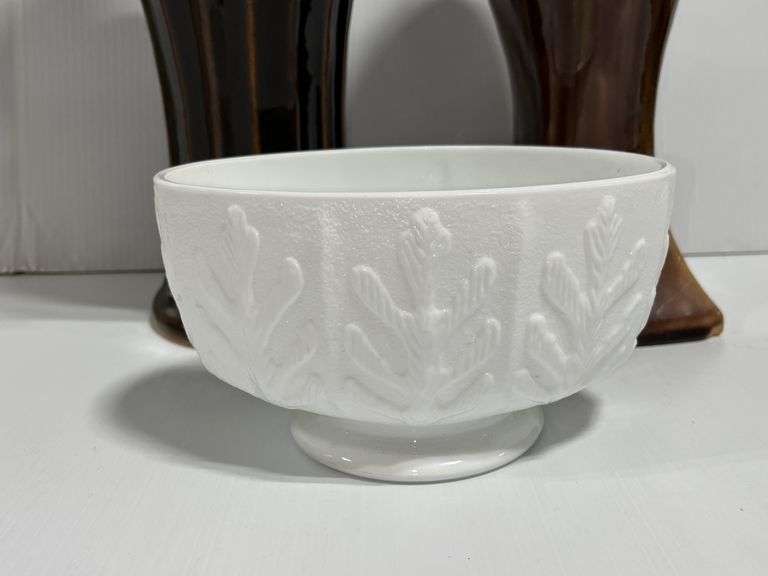 Ceramic modern farmhouse vase, 18"H; Ceramic dip glaze vase, 14"H, has some crazing; Oak leaf milk glass oval compote planter