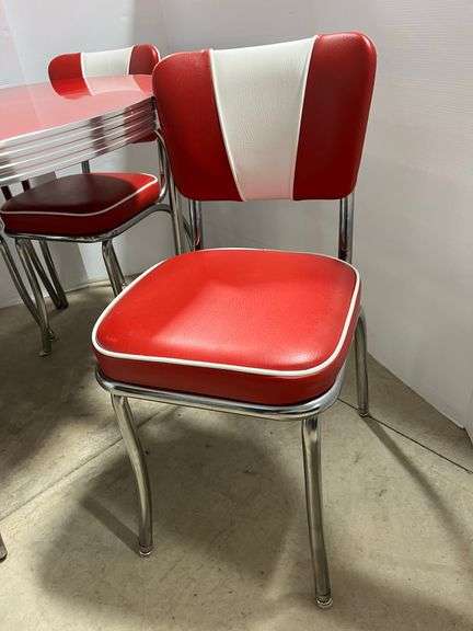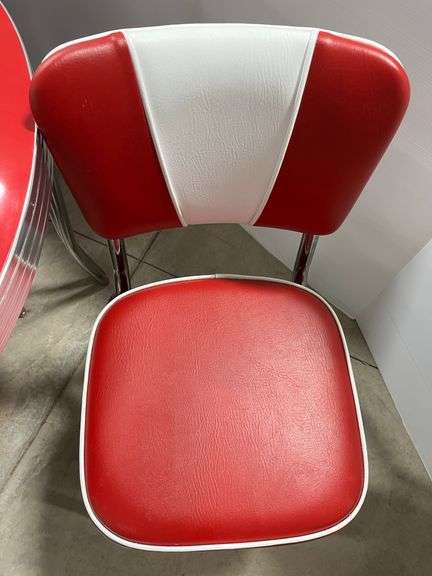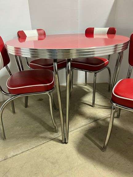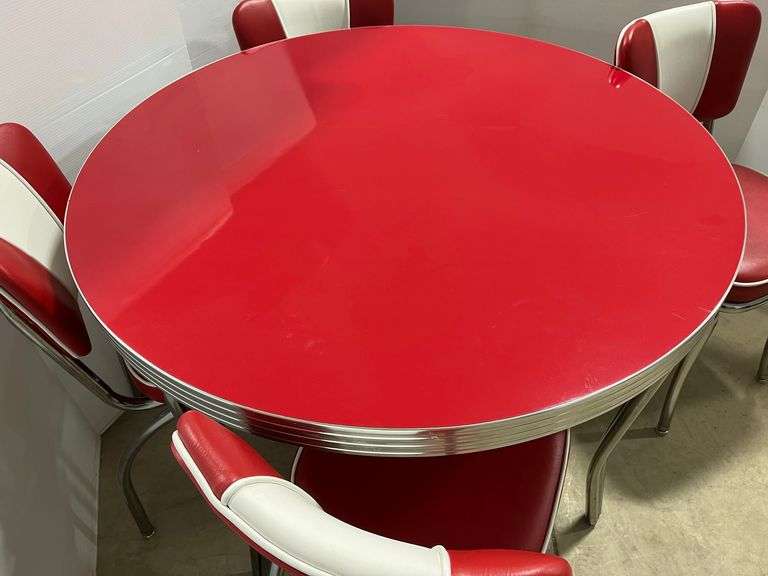 Red and white round retro style table, and (4) matching chairs, Vitro Brand, made in USA, table- 42"Dia x 31"H, all items are scratch and cut free, in very good condition, used,