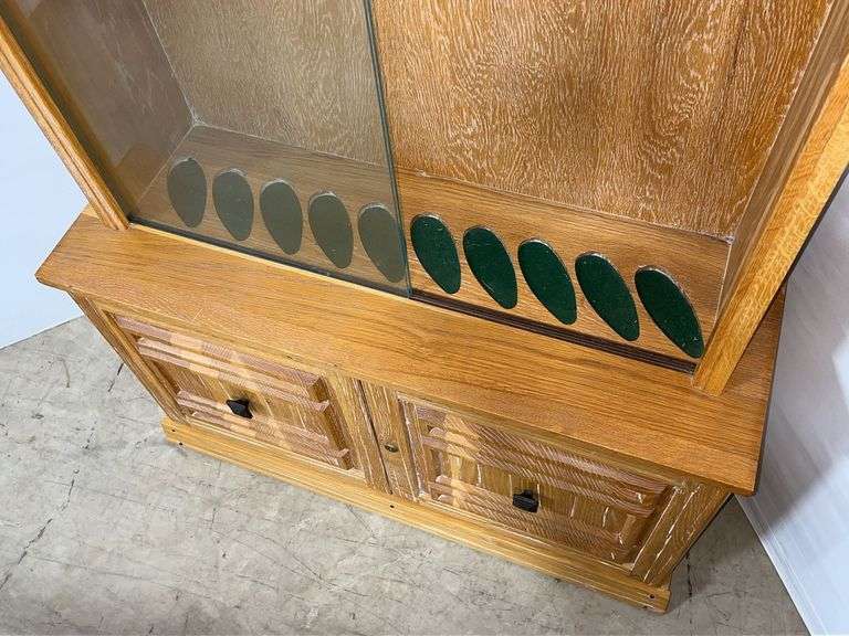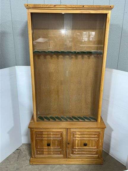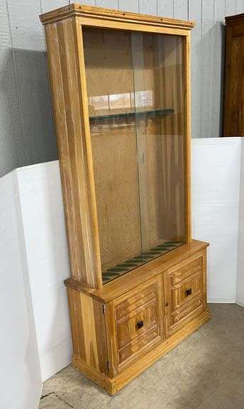 Wooden gun cabinet with sliding glass doors, 10-place, 37"W x 13"D x 74 1/2"H, no key