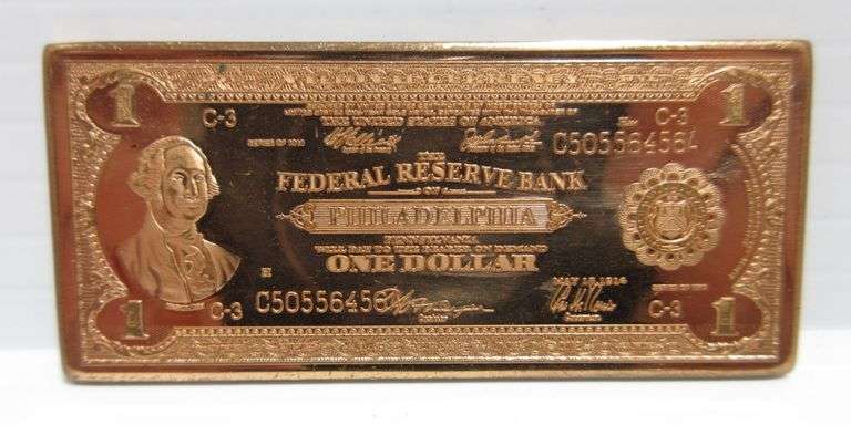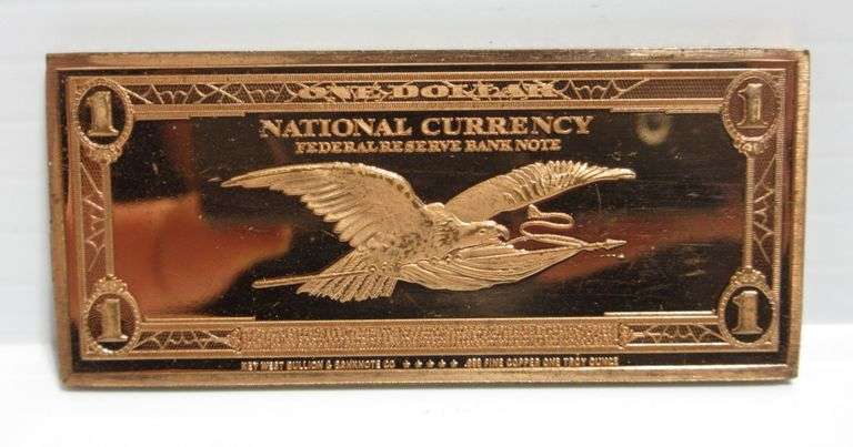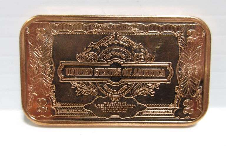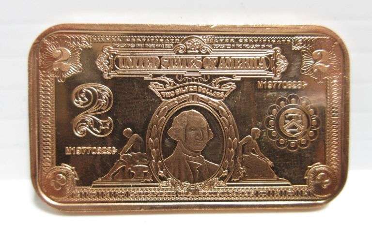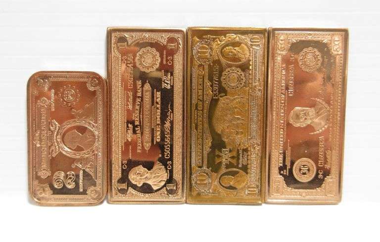 (4) .999 fine copper bars with US currency designs, include: $1, $2, $10, and $50
