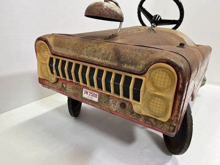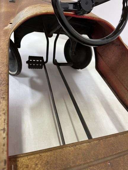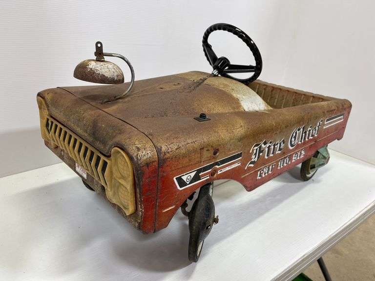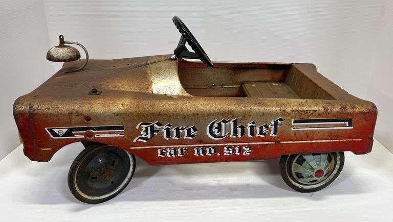 Vintage AMF Fire Chief Pedal Car, No. 512, in original condition, paint is faded but it is in solid condition, it has lettering, bell, and one hubcap, 35 1/2"L