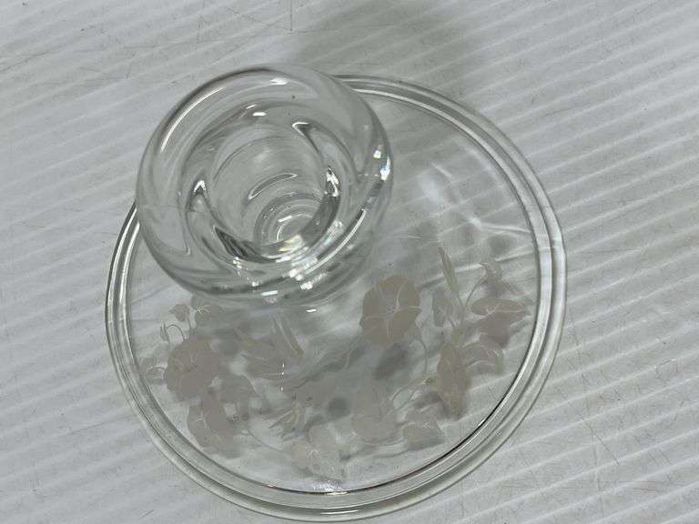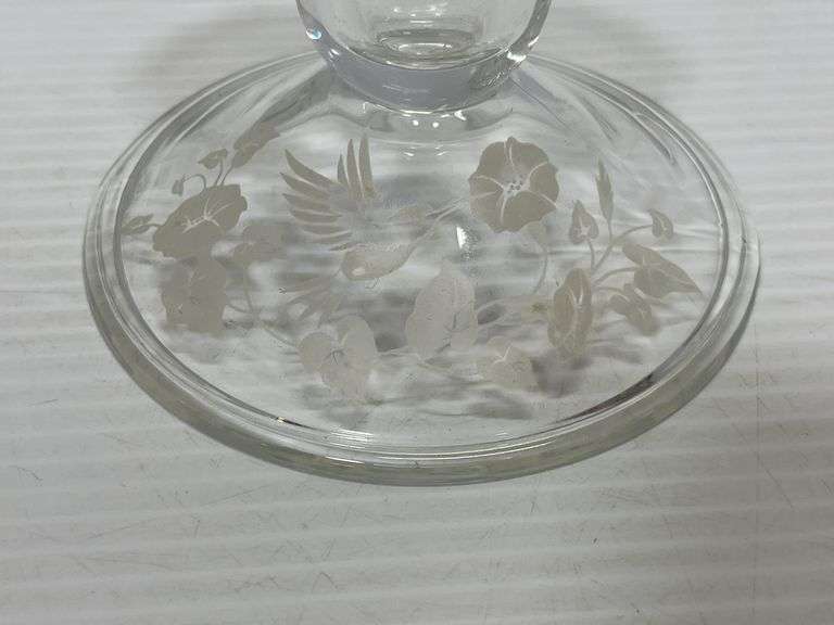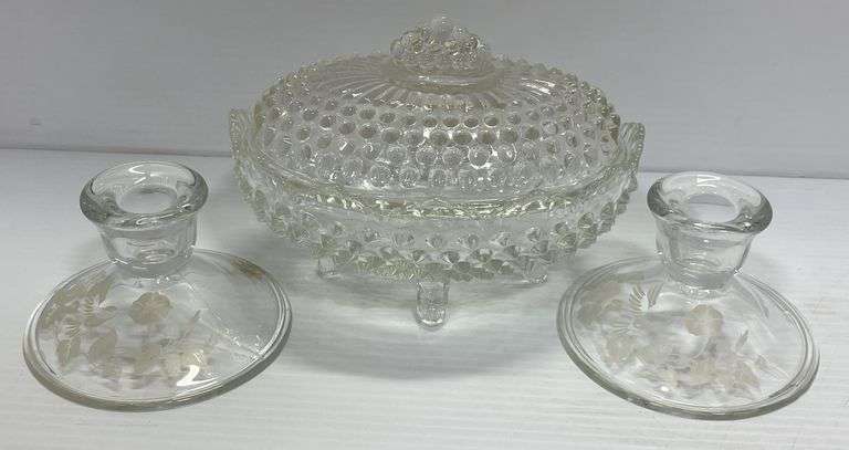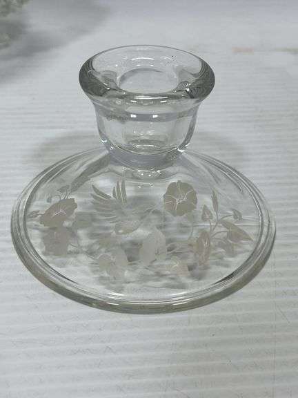 Glass footed bowl/dish with lid; Pair of etched hummingbird candle holders, up to 4 1/2"H, no chips or cracks