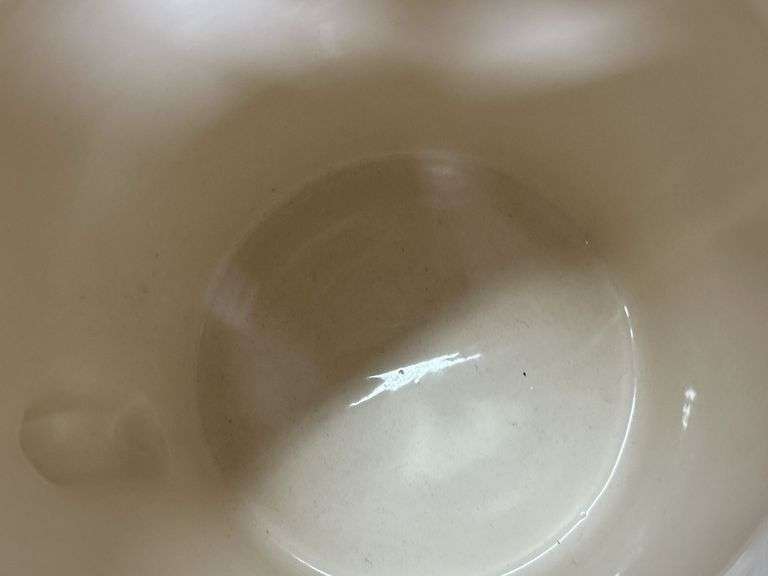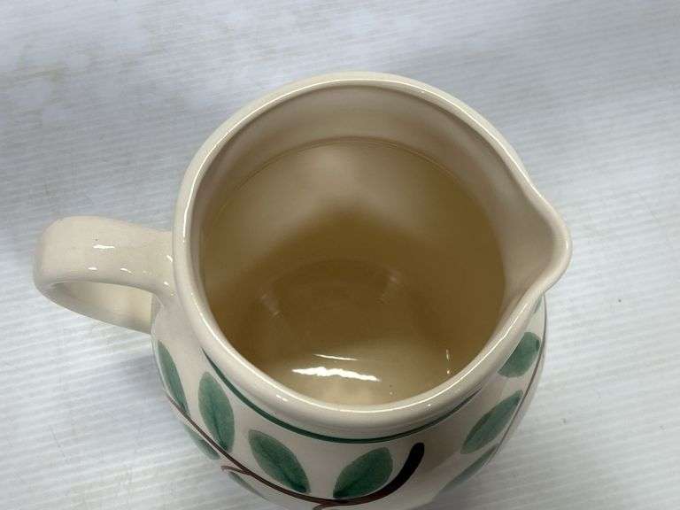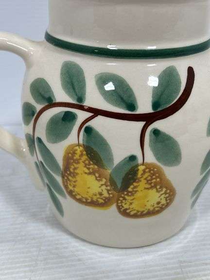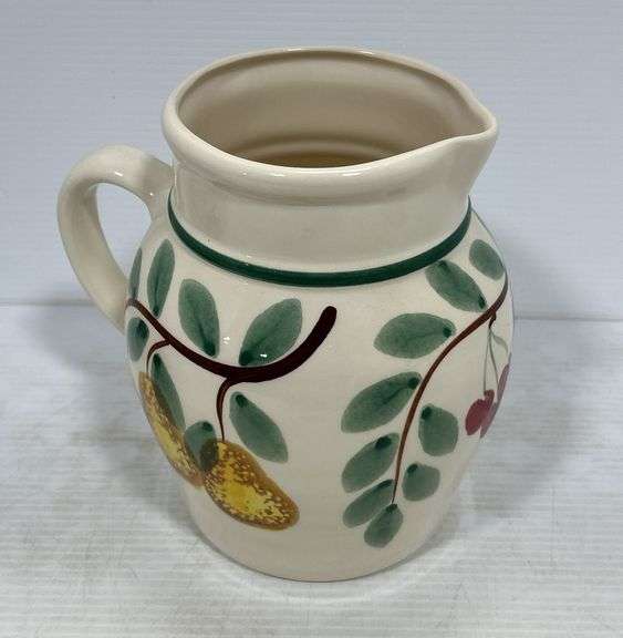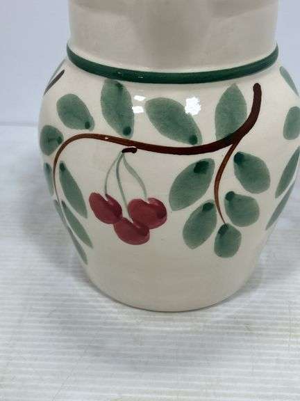 Crock Shop Santa Ana ceramic pitcher; Cherries and pear design on ivory background, 8"H