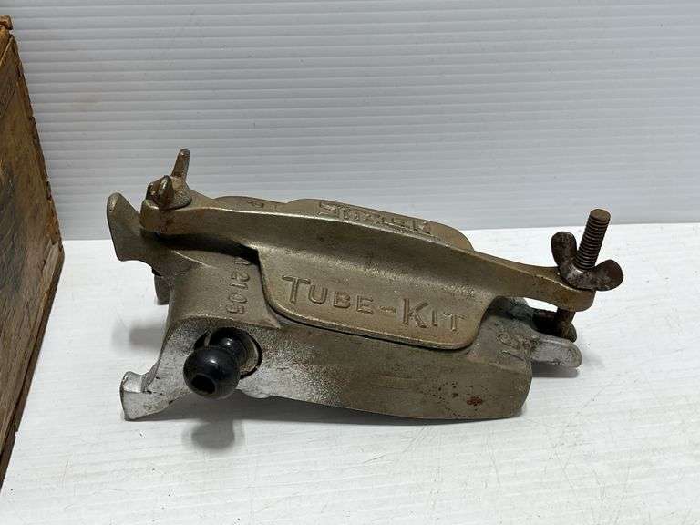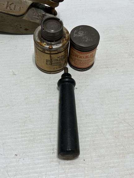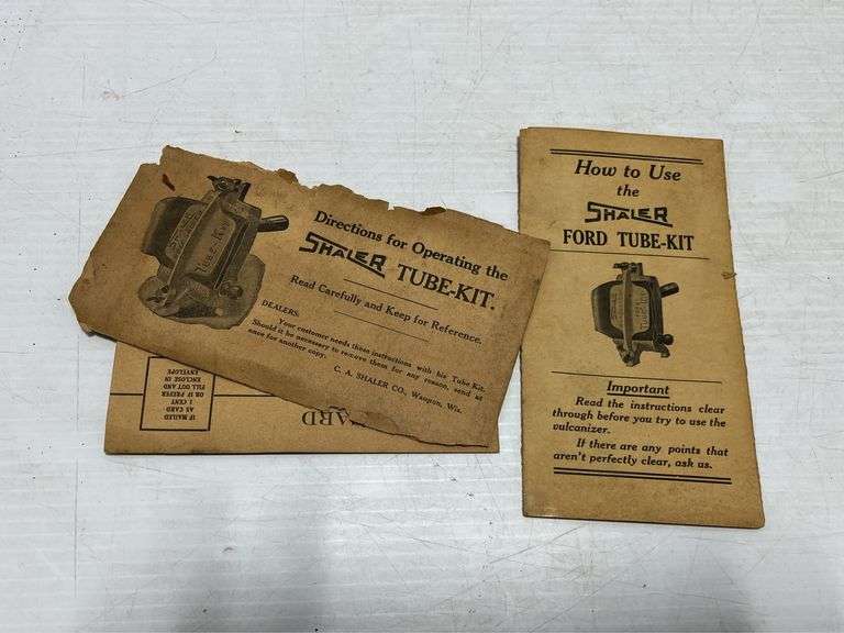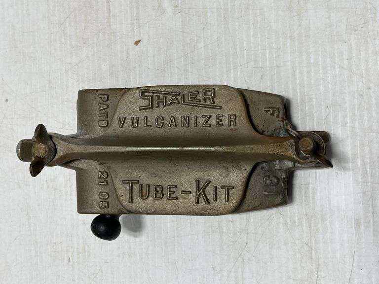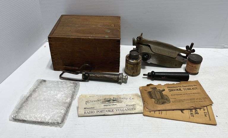 Shaler Vulcanizer tube repair kit with Ford tube kit instructions, and a radio portable Vulcanizer dovetail wooden box, 7 1/2" x 5 3/4", partial contents in box