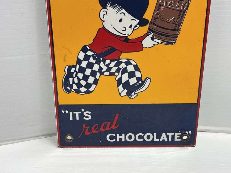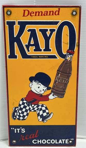 Kayo Chocolate Milk porcelain enamel heavy metal sign by Ande Rooney, 6" x 12", good