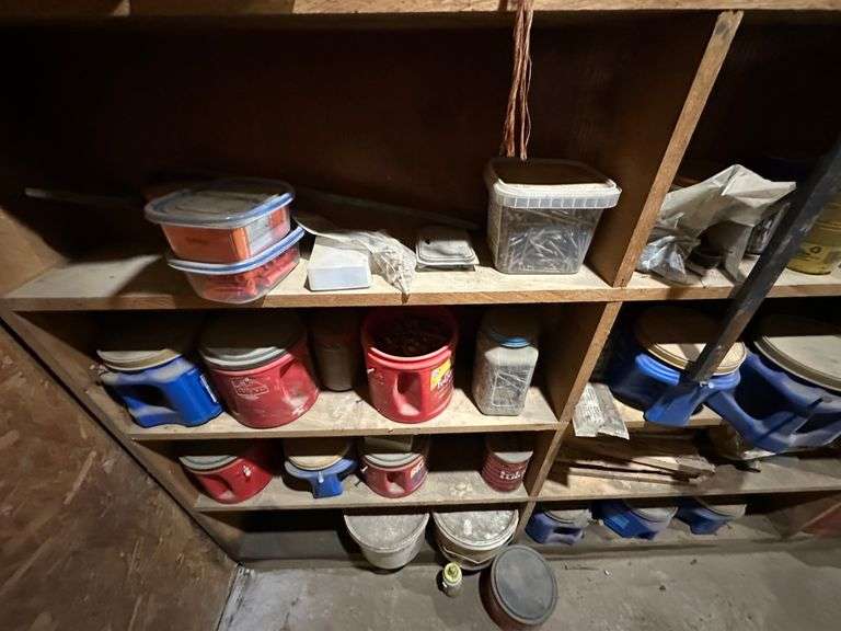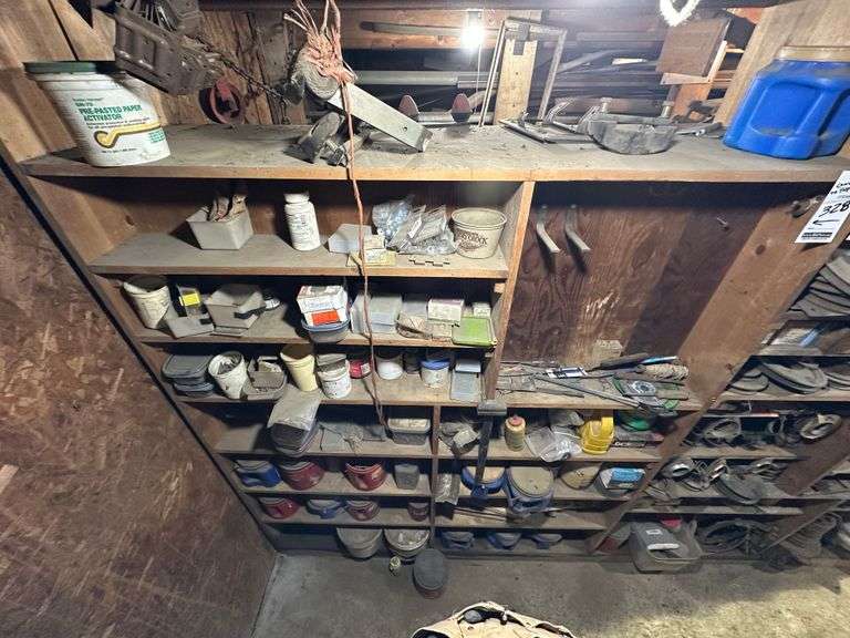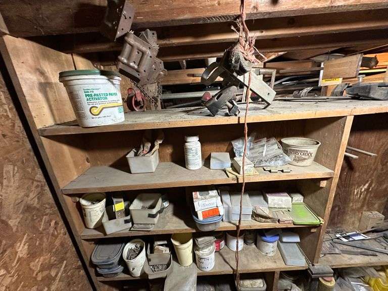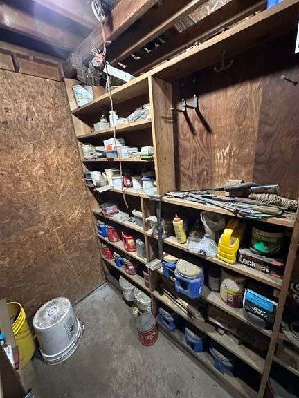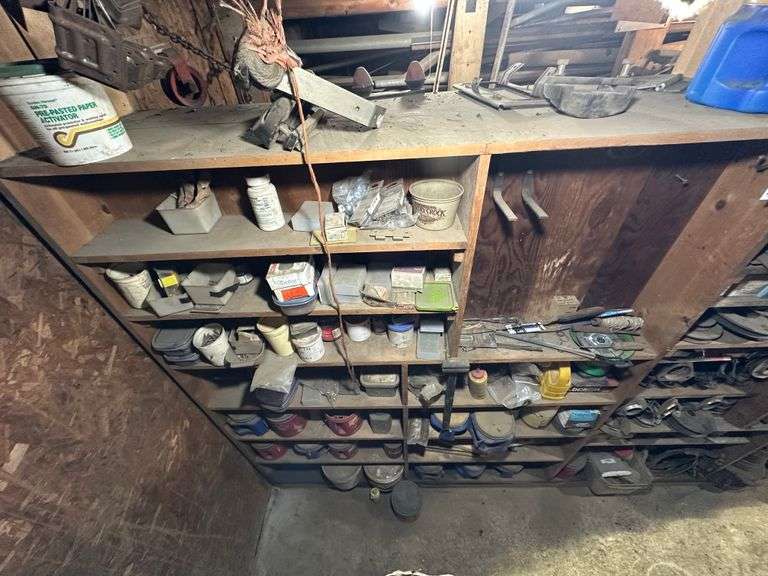 Contents of Wooden Storage: Miscellaneous Hardware Including Nails, Screws, Miscellaneous Tools and More. Wooden storage bins Not Included. Bring your own totes and bring help for loading. A video of contents has been added to additional pictures.