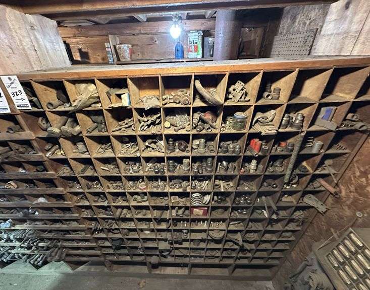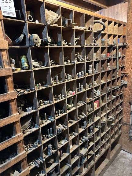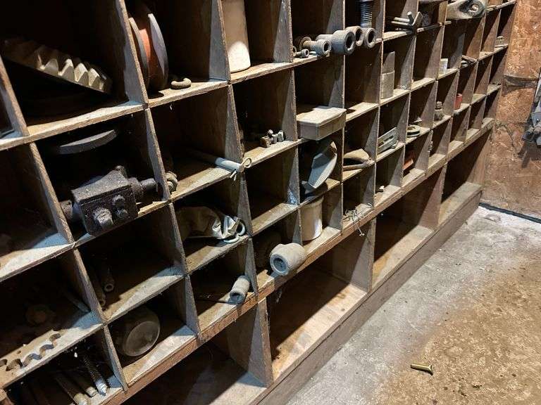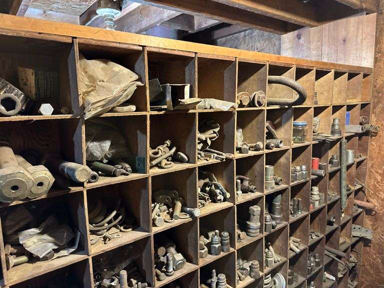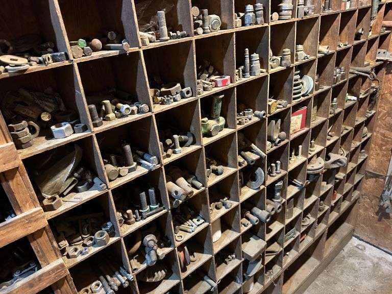 Contents of Wooden Storage: Large Quantity of Miscellaneous Hardware! Lots of Good Hardware! Wooden storage bins Not Included. Bring your own totes and bring help for loading. A video of contents has been added to additional pictures.