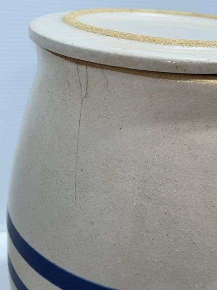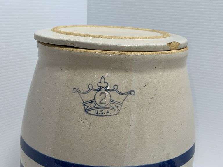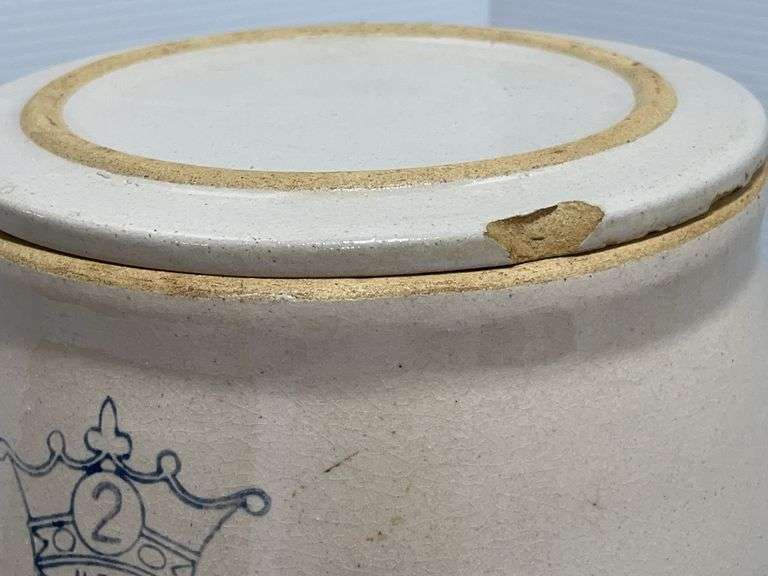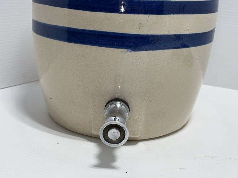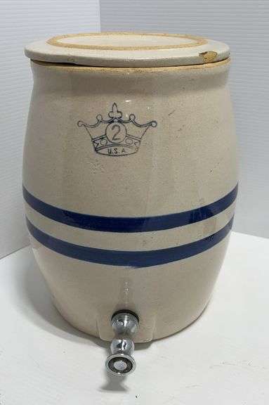 Williamsburg 2-Gallon dispensing crock jug with lid, created 1950-1969, chrome dispensing nozzle, 10.50"W x 12", jug very good, lid- some chips