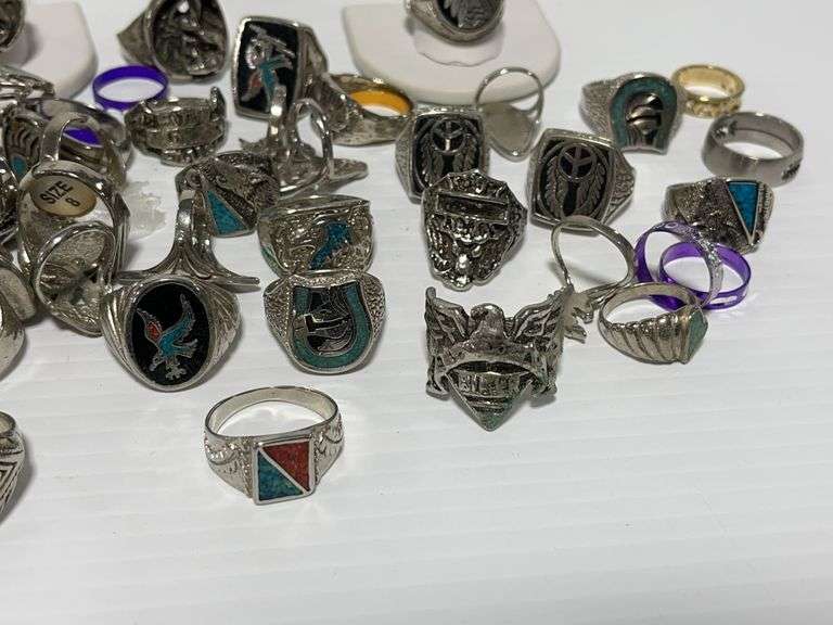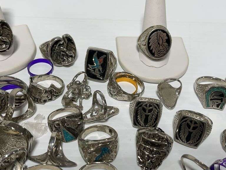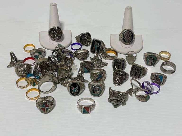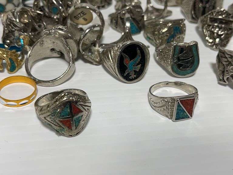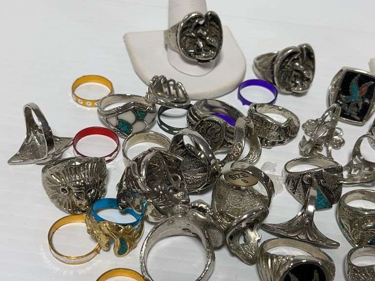 (50) Rings, up to size 11, Except where specifically noted, jewelry lots have not been authenticated. Stone authenticity is not guaranteed by Albrecht Auction and should be personally determined by bidder prior to bidding. Jewelry with precious metal content will be listed as being marked or stamped. Jewelry that is not marked or stamped should not be assumed to contain precious metal content.