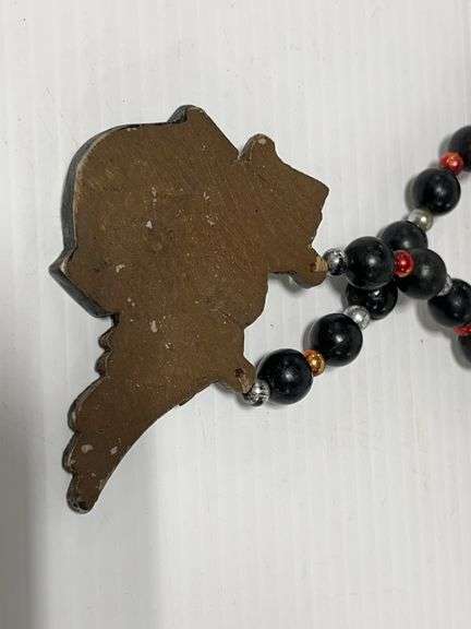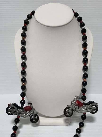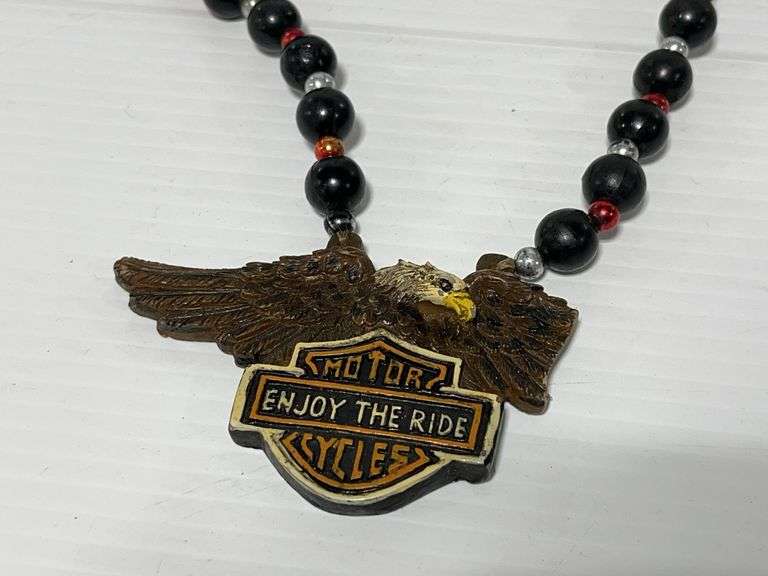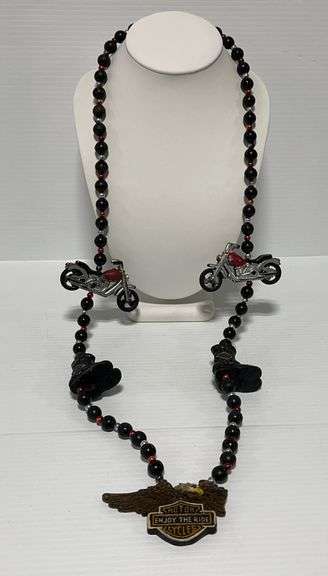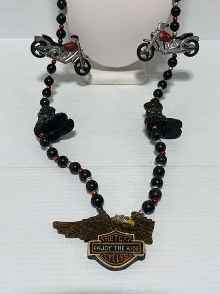 Older Harley-Davidson beaded large wing motorcycle and Harley boots Mardi Gras necklace, 23"L, good, eagle wing is broken, Except where specifically noted, jewelry lots have not been authenticated. Stone authenticity is not guaranteed by Albrecht Auction and should be personally determined by bidder prior to bidding. Jewelry with precious metal content will be listed as being marked or stamped. Jewelry that is not marked or stamped should not be assumed to contain precious metal content.