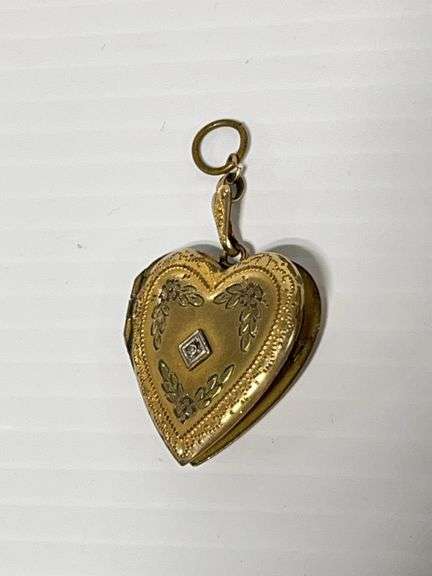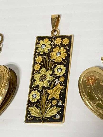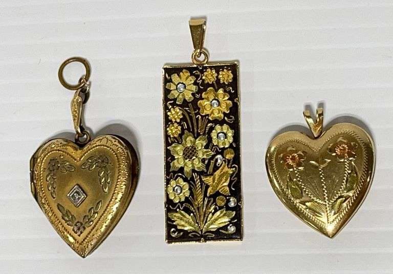 (3) Older pendants: 2- Hearts, and 1- Damascene gold-tone floral piece, up to 3/4" x 1 1/2", very good, Except where specifically noted, jewelry lots have not been authenticated. Stone authenticity is not guaranteed by Albrecht Auction and should be personally determined by bidder prior to bidding. Jewelry with precious metal content will be listed as being marked or stamped. Jewelry that is not marked or stamped should not be assumed to contain precious metal content.