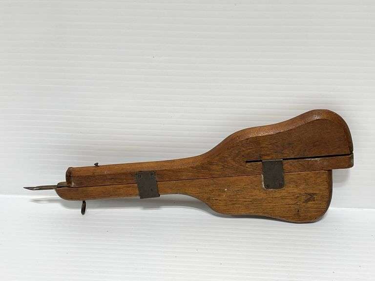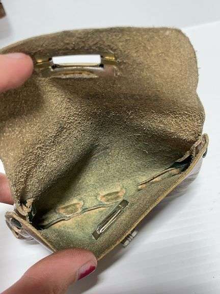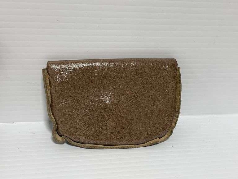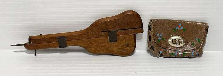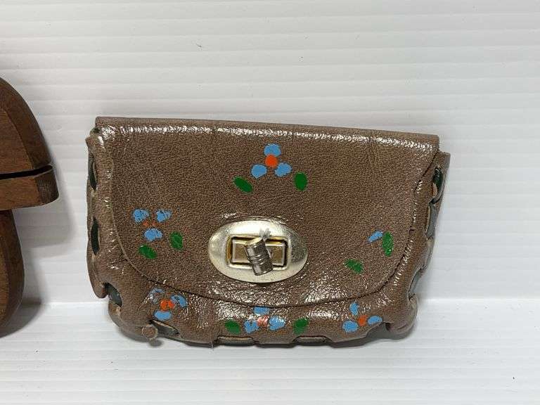Antique E-Ross & Co., machine rug hooking tool, also vintage leather, brown hand painted coin purse, made in Mexico, handmade 3"W x 4 1/2"L, very good