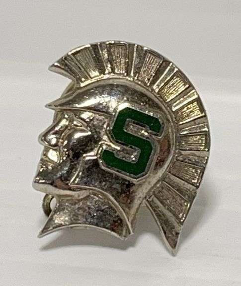 Sterling silver Michigan State University Spartans Terry Berry brand pin, 1/2"H, great; Except where specifically noted, jewelry lots have not been authenticated. Stone authenticity is not guaranteed by Albrecht Auction and should be personally determined by bidder prior to bidding. Jewelry with precious metal content will be listed as being marked or stamped. Jewelry that is not marked or stamped should not be assumed to contain precious metal content.