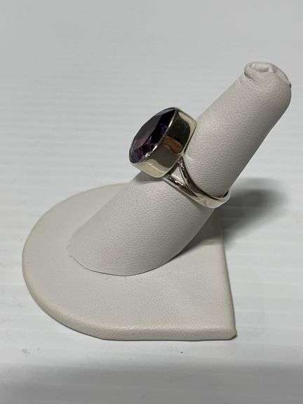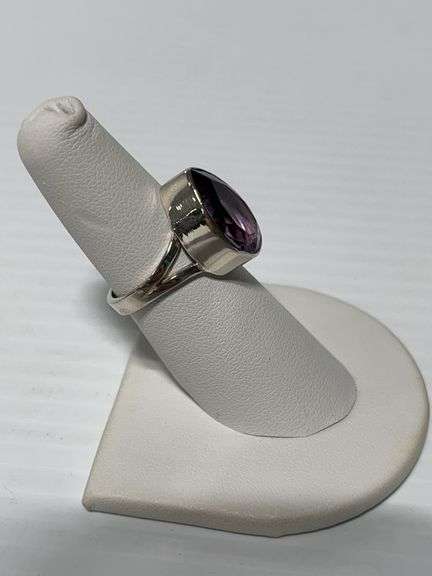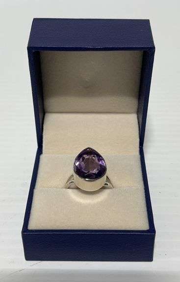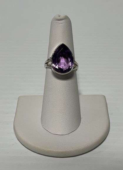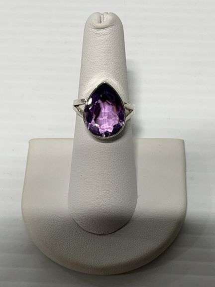 6.40 ct. genuine pear cut amethyst ring, size 7, natural gemstone, sterling silver setting; Except where specifically noted, jewelry lots have not been authenticated. Stone authenticity is not guaranteed by Albrecht Auction and should be personally determined by bidder prior to bidding. Jewelry with precious metal content will be listed as being marked or stamped. Jewelry that is not marked or stamped should not be assumed to contain precious metal content.