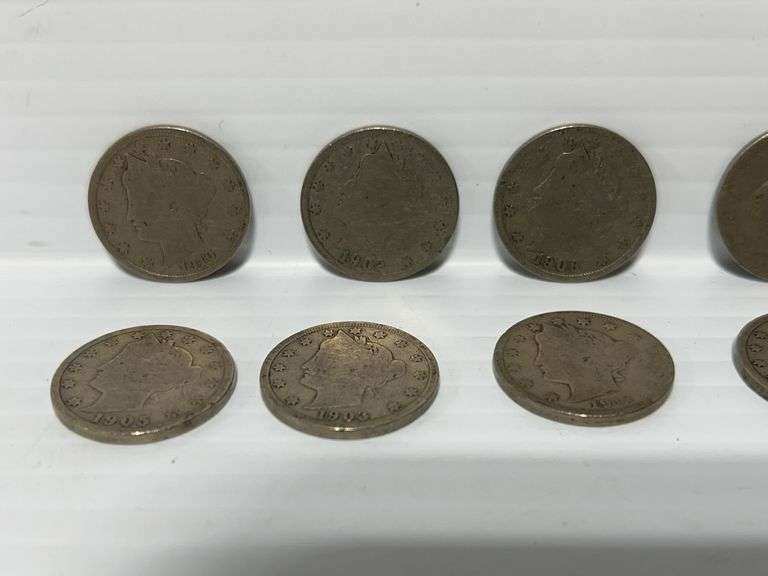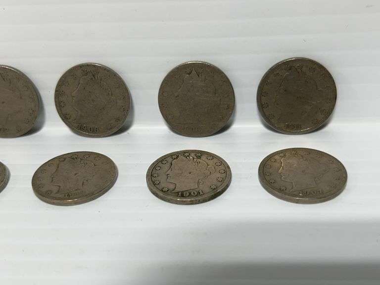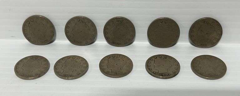 (10) Liberty V-nickels, all different dates, 1901 to 1912, nice shape
