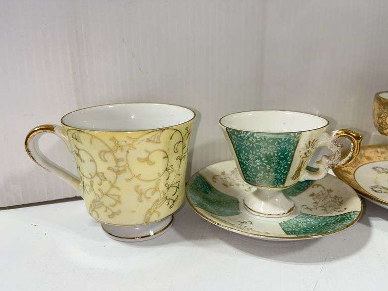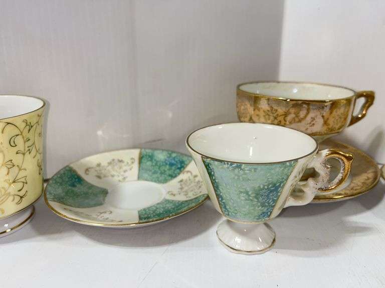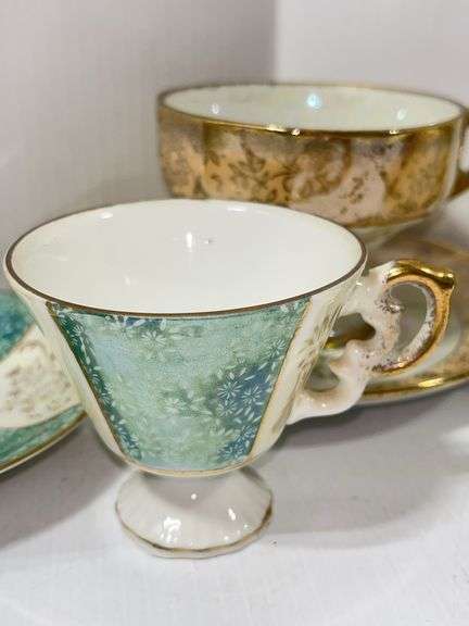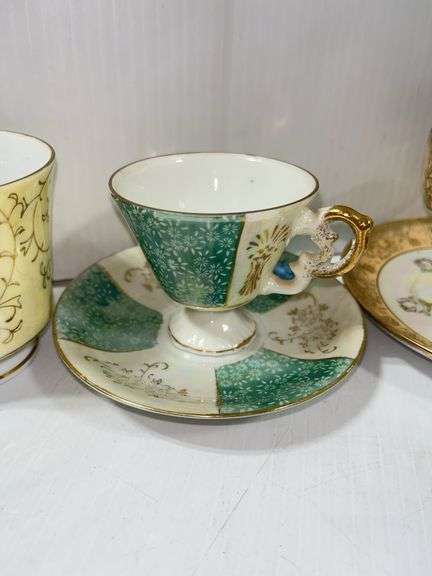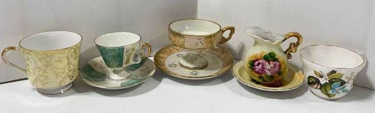 Lusterware 1950s teacups, saucers, and pitcher, includes: (1) Tilso/Lusterware cup and saucer, made in Japan, 3 1/2" and 5 1/2"H; (1) Green/white Lusterware, 4 1/2"W x 2 1/2"H; (2) Norlean Luster/Bone China; (1) Small 3" Pitcher with dish, Fairway Japan, pitcher has a small chip on lip, otherwise all good