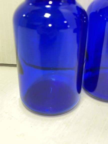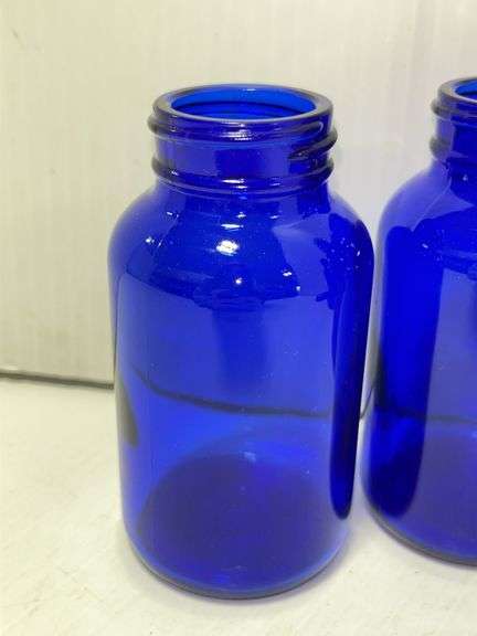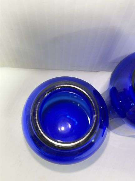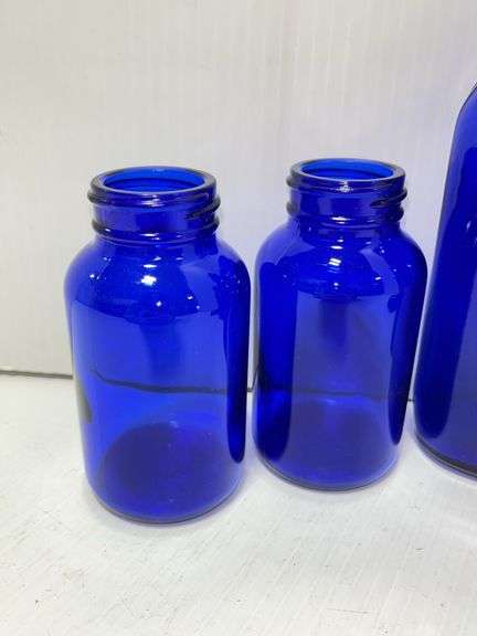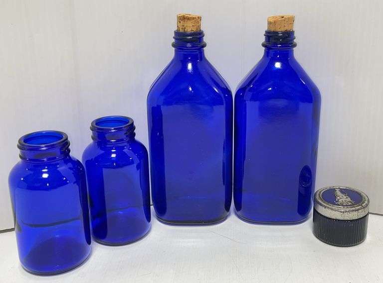 (4) Cobalt blue bottles, and an Avon cream sachet "Moonwind", up to 8"H