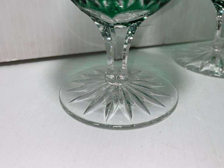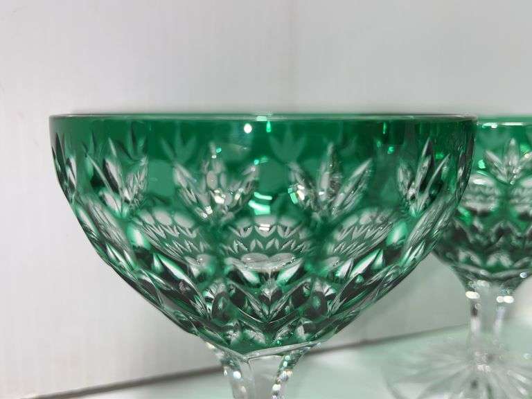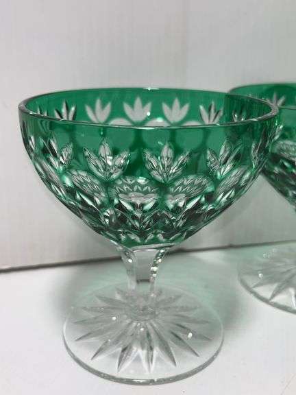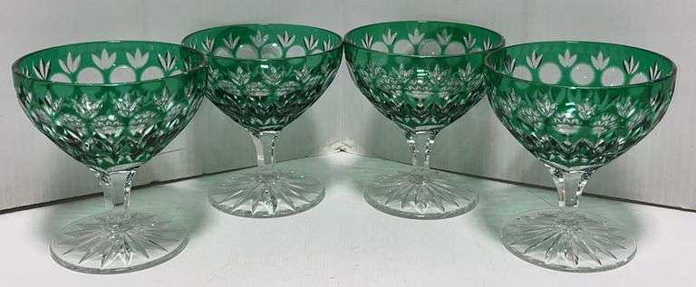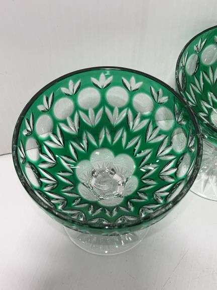 (4) Green cut to clear glass crystal dessert stem bowls, 4 1/2"H, excellent
