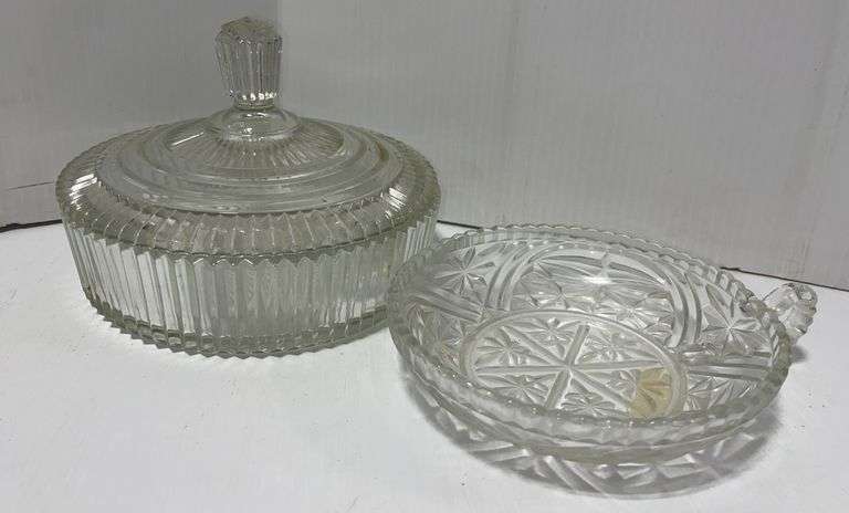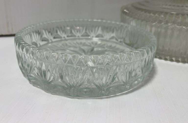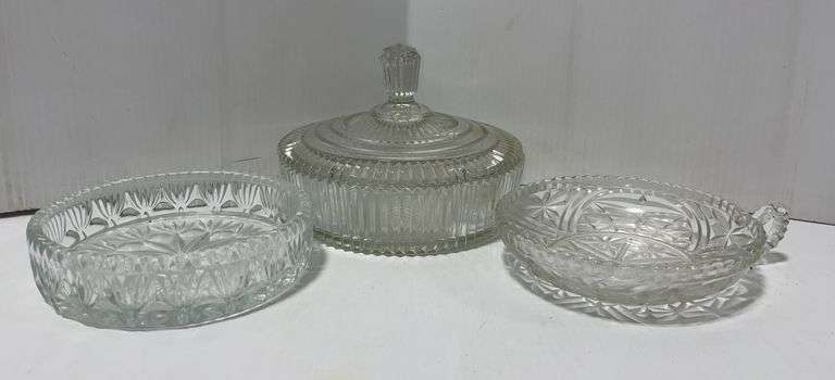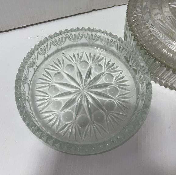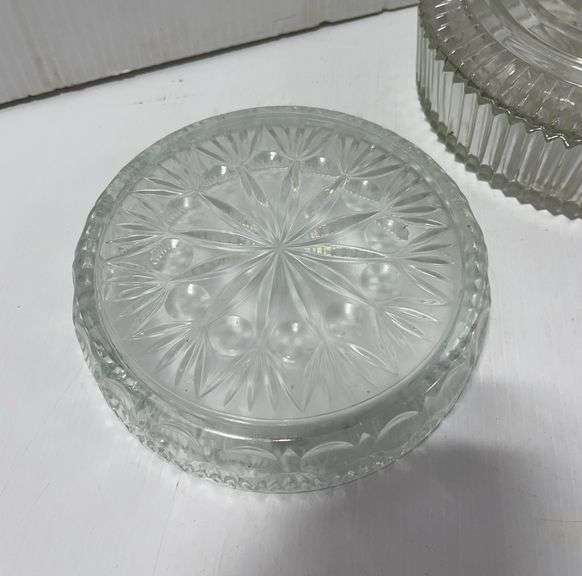 Square glass jar, heavy thick glass, 6"W x 10"H, no chips or cracks, excellent; Older candy dish with lid, 8"W x 6"H; (2) Other dishes with cut glass design, 6"W x 1 3/4"H