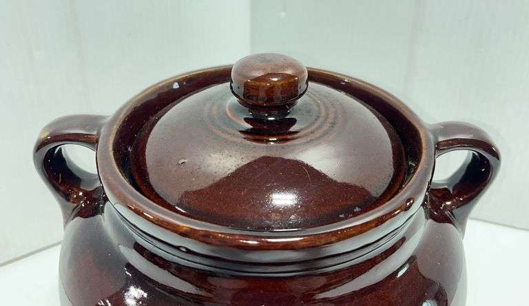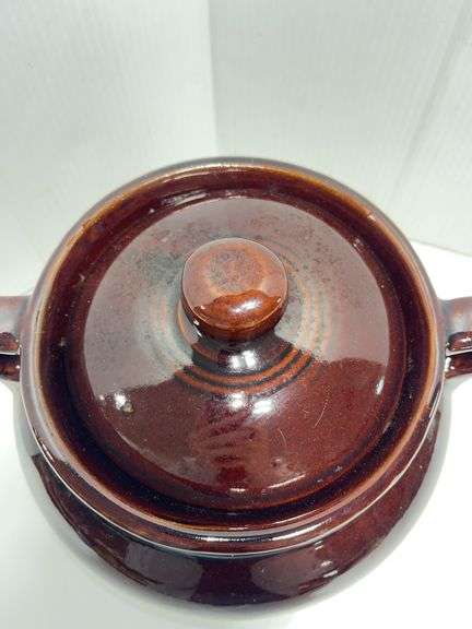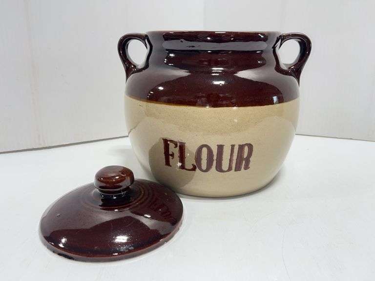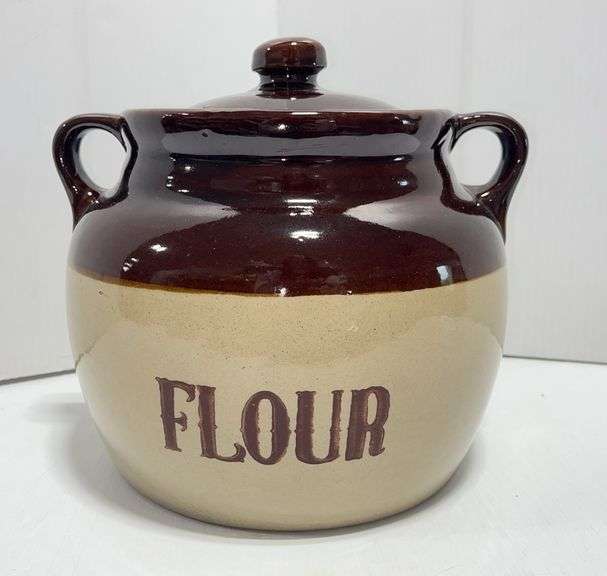 Older Monmouth flour crock canister pottery stoneware farmhouse, primitive with handles on side weighs, 7 lbs., 10"W x 9 1/2"H, crazing on the bottom, used