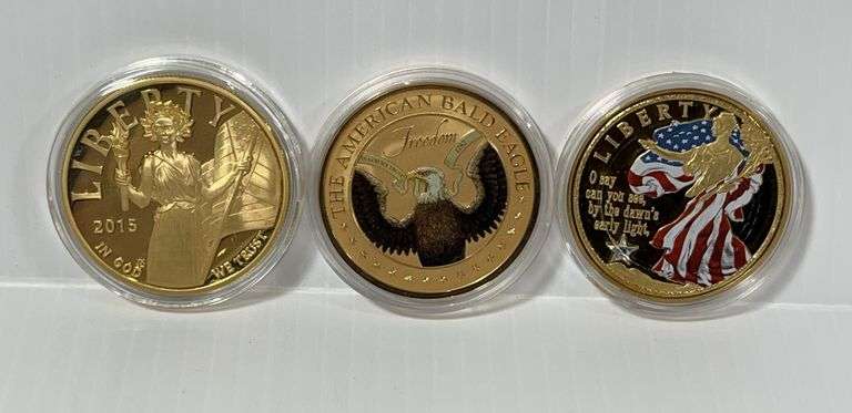 (3) American Mint collectors coins, all with paperwork of authenticity, includes: US Coinage of High Relief; Our Nation Anthem Colorized; Great Seal of US, all numbered for collecting the complete set