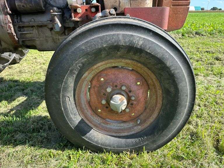 1971 Massey Ferguson 165 Diesel Tractor, Ser. No. 111819, 3-pt., PTO, Drawbar, Rear Hydraulics, (Showing 5,273 Hrs.), 7.50-16 Fronts, 15.5-38 Rears with Duals, Power Adjust Rims, (6)-Front Suitcase Weights, Runs Well. Fuel sender for the fuel guage only works for part of the tank, lights unknown condition. NOTE: There is a square bracket mounted toward the front of this tractor that is Not Included. It is the bracket that goes with Item #22 Farmhand Hay Rake.