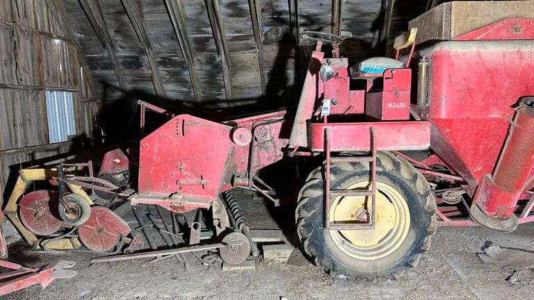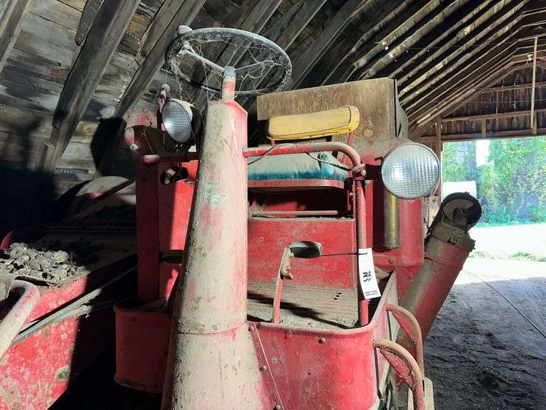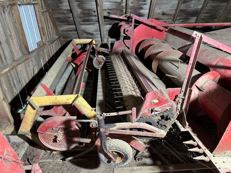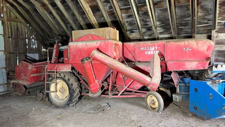 Massey Harris 72 Combine with Grain and Pickup Head, As Is. Someone came to the farm within the last 20 years to work on this combine and get it running. It took the mechanic 15 minutes and it was running. The last time used in the fields is thought to be in the 1990s. NOTE: Buyer is responsible for the safe and timely removal of this item and for all equipment and tools required to move it. The auction company and estate will not provide assistance.