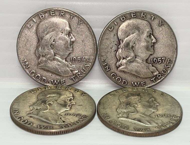 (4) Franklin half dollars, 90% silver, dates include: 1952, 1954, 1957, and 1963