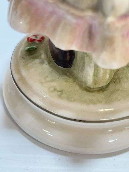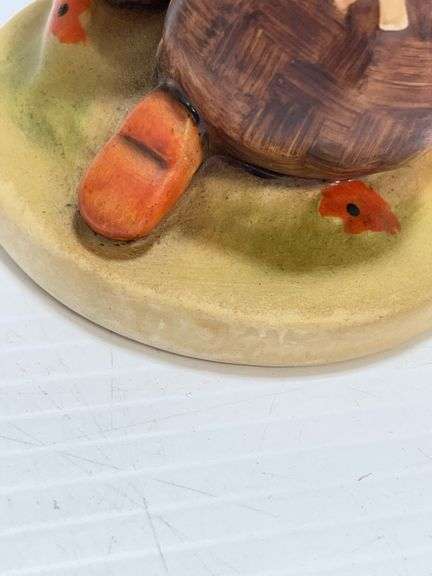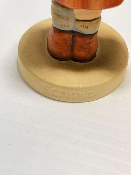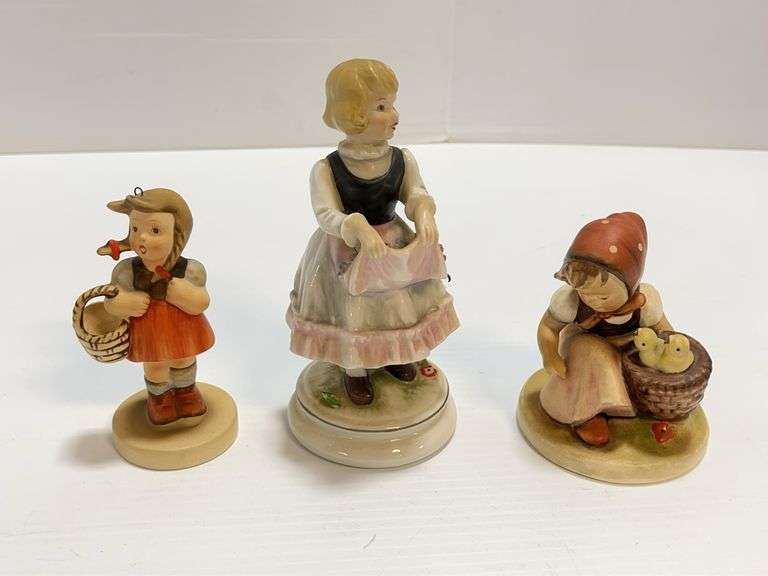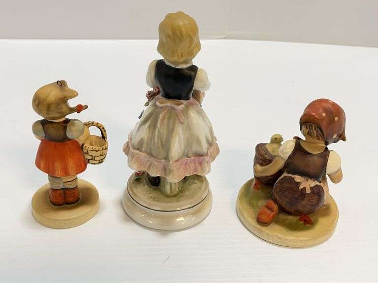 (2) Goebel figurines: 1- "Apron Full of Flowers", 4 1/4"H; 1- "Girl with Baby Chicks", 4"H; (1) Schmid reproduction of Hummel "Girl with Basket" figure, made in 1984, 6"H, all very nice