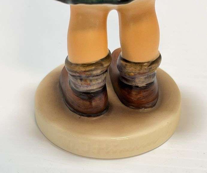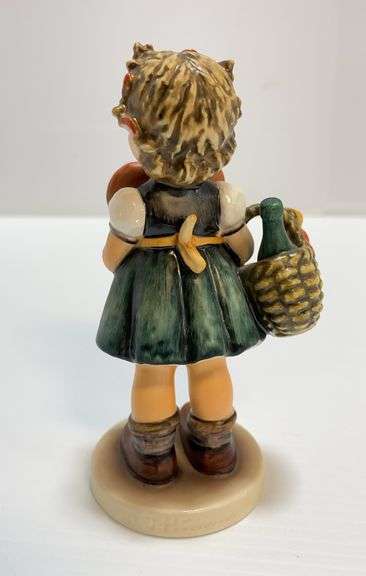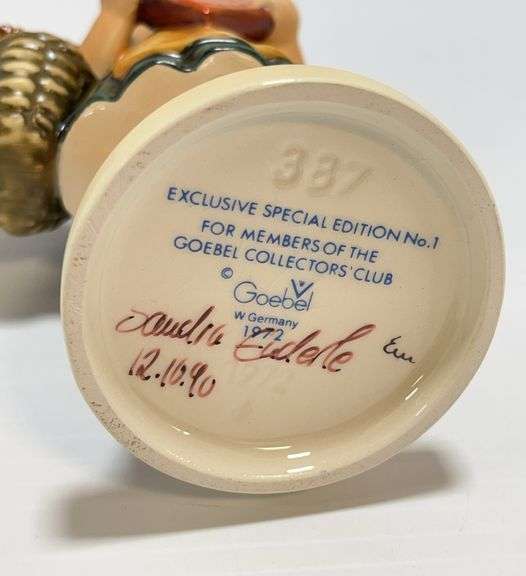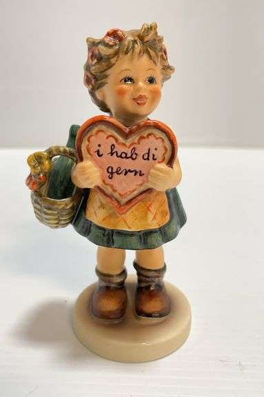 1972 Signed exclusive special edition Hummel figurine, "Valentine Gift" girl with heart and basket, no. 387, trademark 5, vibrant paint and detail, 5 3/4"H, some crazing