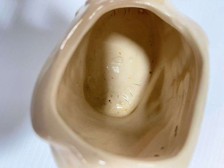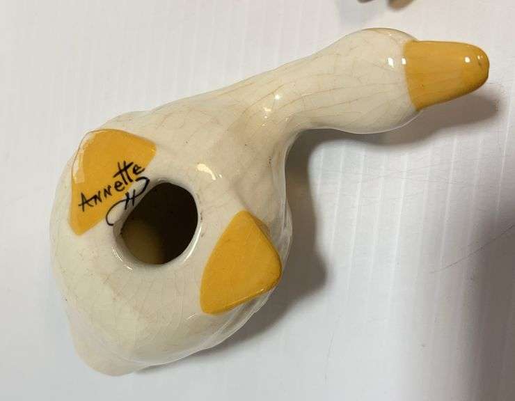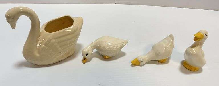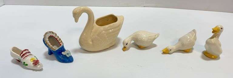 1920s Brush McCoy planter white ceramic swan, 5" x 6"; (3) Older duck figurines, various poses, up to 4"L; (2) Mid-century miniature porcelain shoes