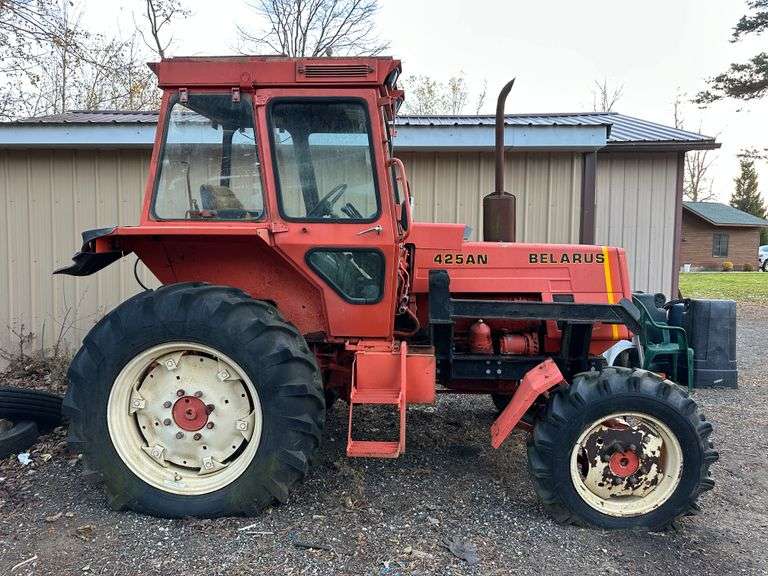 Belarus 425A 4wd Tractor with Loader and Mounting Bracket, 3-pt., PTO, Rear Hydraulics, (2)-Flat Tires. Tractor is Not Running. NOTE: Loader can be seen in the additional pictures.