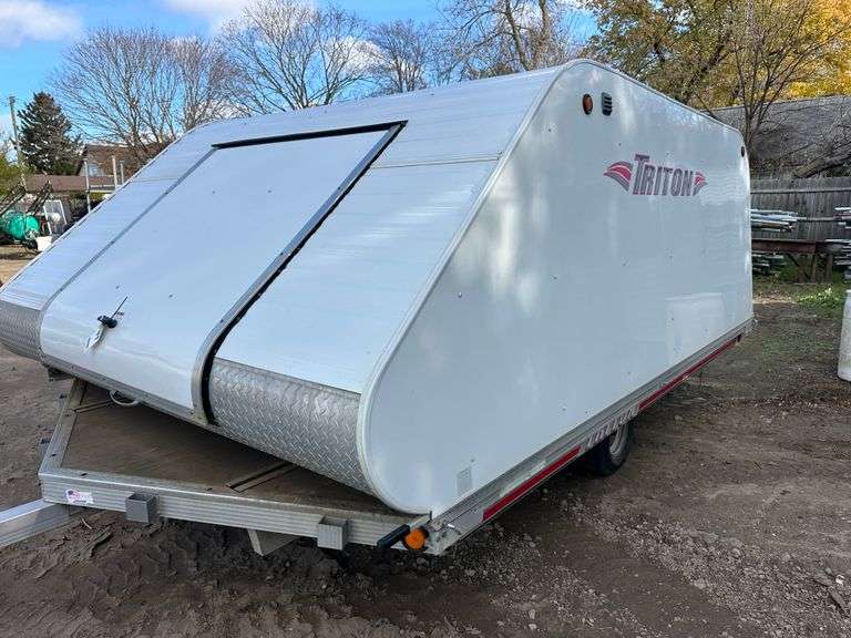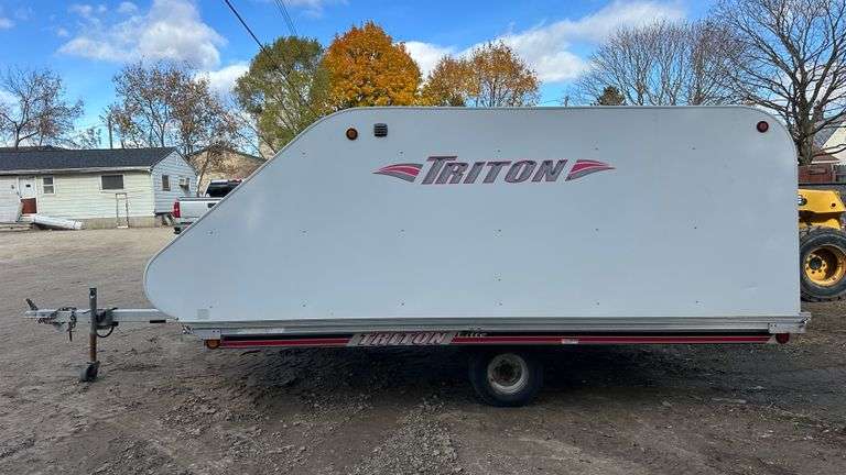 Triton 2-Place Snowmobile Trailer with Triton 12' 2KF Cover, 8' x 12', Front Access Door, Ramps, 205/65-10 Tires. Sells with Bill of Sale.